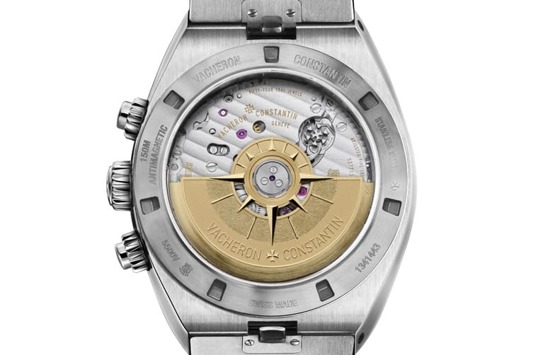 Overseas計時碼錶錶背透明底蓋可見手錶搭載的5200自動機芯,其22K金自動盤飾有呼應系列旅行精神的風向玫瑰羅盤圖案、機芯底板以日內瓦波紋修飾,展現符合日內瓦印記要求的高作工水準。錶款的計時功能由導柱輪搭配垂直離合掌控,後者的優點在於能夠有效降低計時指針在啟動時產生的顫動情況,細看導柱輪會驚喜發現它的造型也含有馬耳他十字的概念,整體風格相當一致,至於機芯的品質既然是出自VC手筆,其可靠程度也是公認的優異,這部分亦無需贅言。