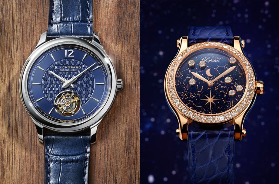 CHOPARD蕭邦以深藍色為主題,一連推出多款作品,其中品牌人氣男、女錶系列包括L.U.C與Happy Sport等都有相對應的作品現身,品牌巧妙地運用同一種色調,賦予不同手錶各有千秋的魅力,例如男錶的藍色顯得成熟穩重,結合複雜功能顯現紳士風範,而女錶則是用藍色演繹象徵宇宙的浩瀚星空,使得手錶在美鑽的烘托下,還多了幾分詩情畫意。
