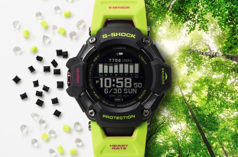 ▲GBD-H2000材質選用環境友善的生質塑膠製作錶殼,搭配碳纖維背蓋有效降低手錶重量。