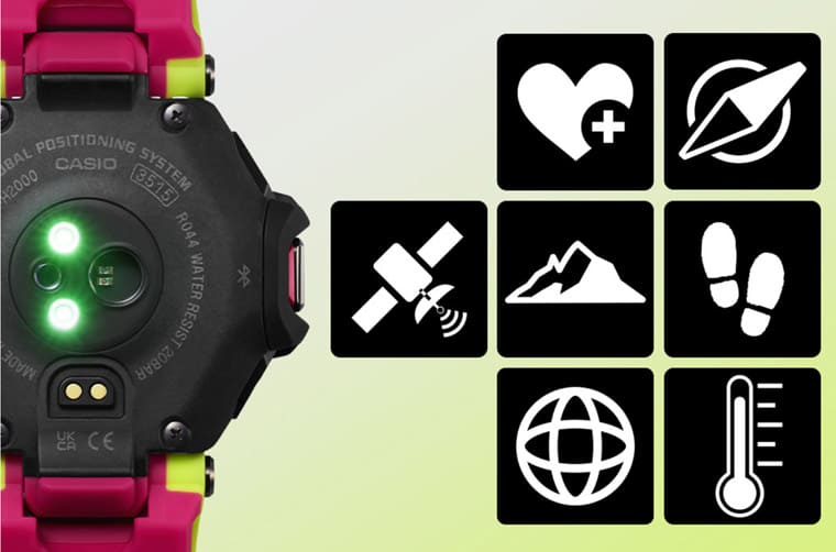 除了外觀用料與重量的變化,GBD-H2000受到市場矚目的部分還在於其強大的運動機能,這款錶搭載GPS定位功能和6大感應器,GPS定位功能提供測量位置、距離與移動速度,讓使用者能夠在運動當下便能追蹤各項數據。而6大感應器包括光學感應器能測量心率,數位羅盤、壓力感應器與溫度感應器能提供方位、高度、氣壓與溫度等各項數據,加速計與陀螺儀則是用來偵測身體動作。