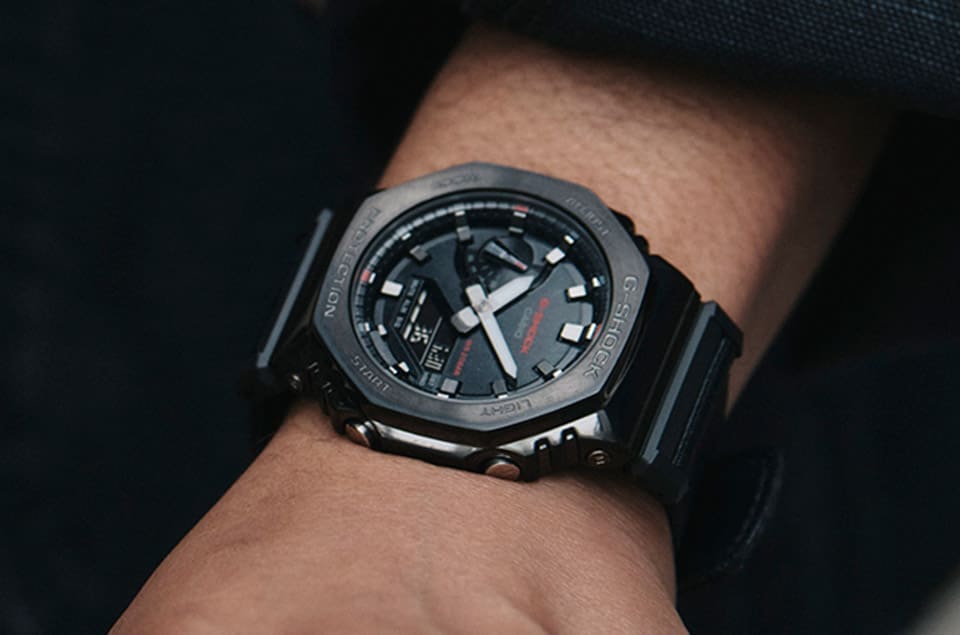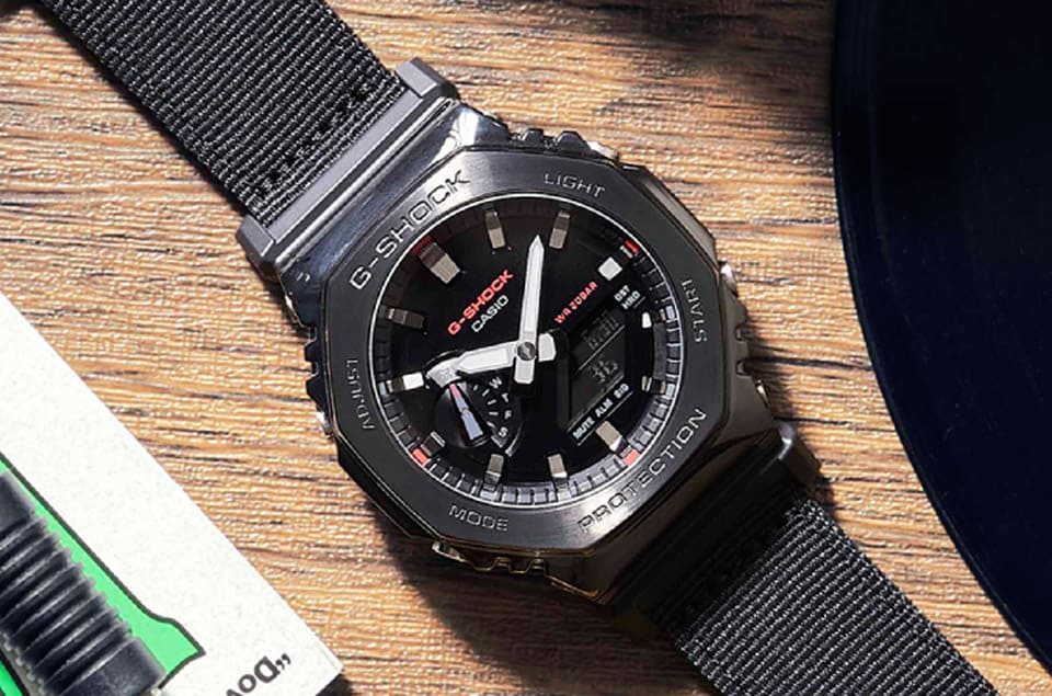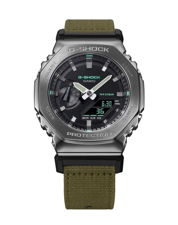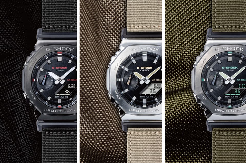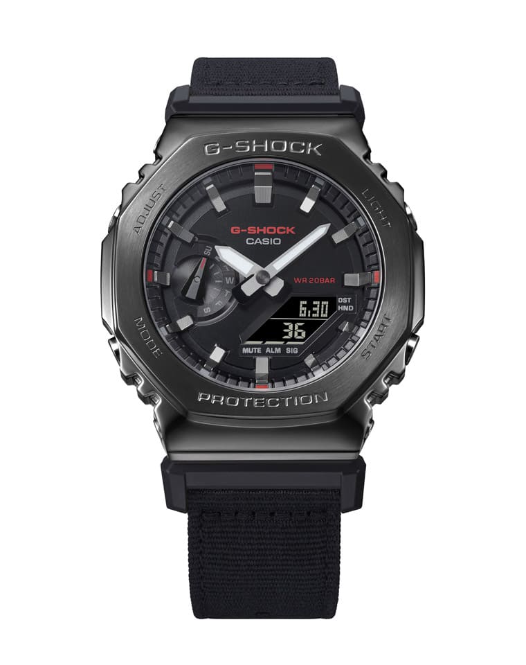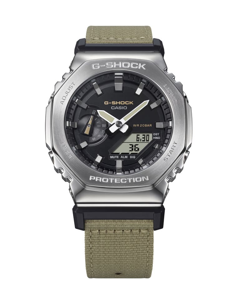 卡西歐G-SHOCK近年的代表作——農家橡樹2100系列是品牌目前指針數位雙顯作品的熱賣型號,G-SHOCK最近新增結合金屬與布料兩種材質的Utility Metal Covered系列(GM-2100CB),利用異材質的搭配開創出農家橡樹的新面貌。