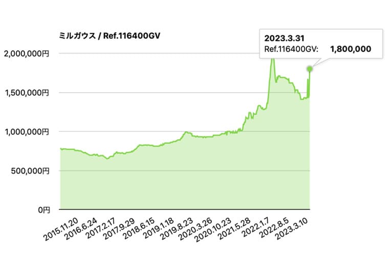 《Power Watch》觀察到Milgauss在2023年3月的第一週時,原本沒什麼波動的行情忽然在短時間內一口氣上漲20萬日幣,但這次的爆衝比2022年初更快歸於平淡,很快又回跌倒140多萬日幣的水準,照理說那個時間點介於勞力士新款要上市前的關鍵期,像Milgauss這種被預期有很高比例會停產改款的作品照理說價格會有比較明顯的上漲空間,可是它只有在3月初像煙火綻放了一下下,接著又彷彿馬上回到現實般複製它前幾個月的平穩行情。