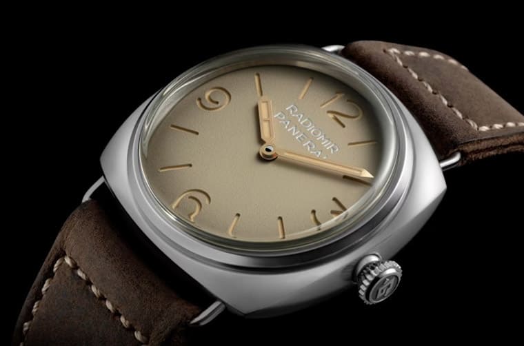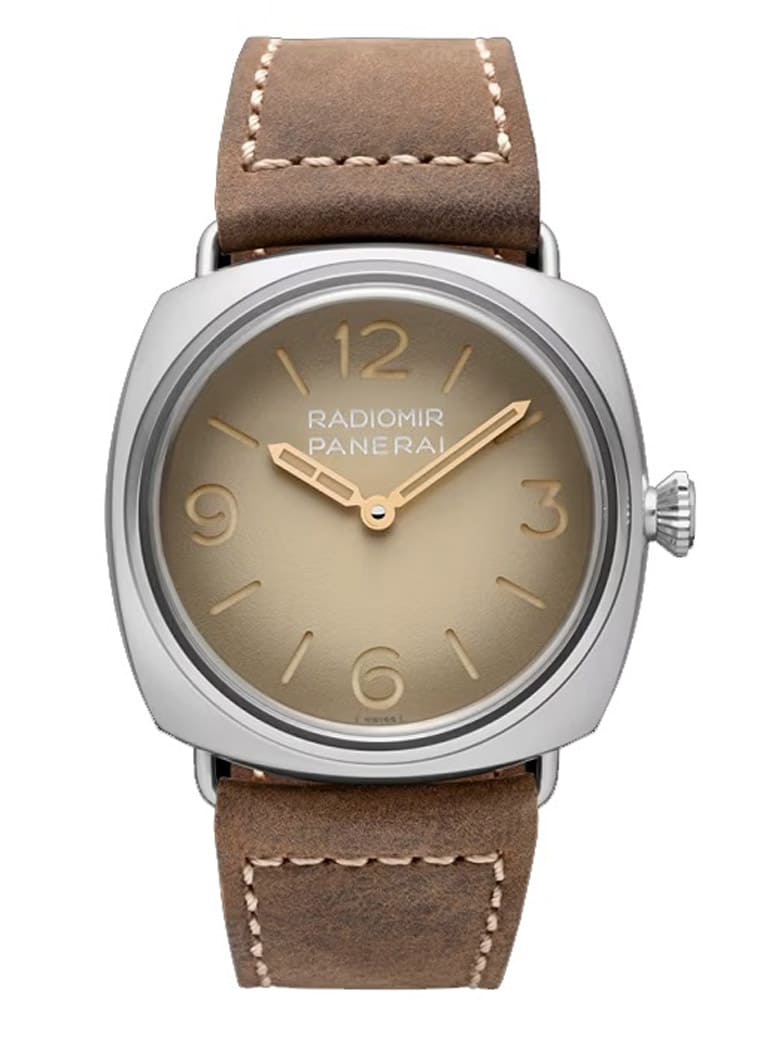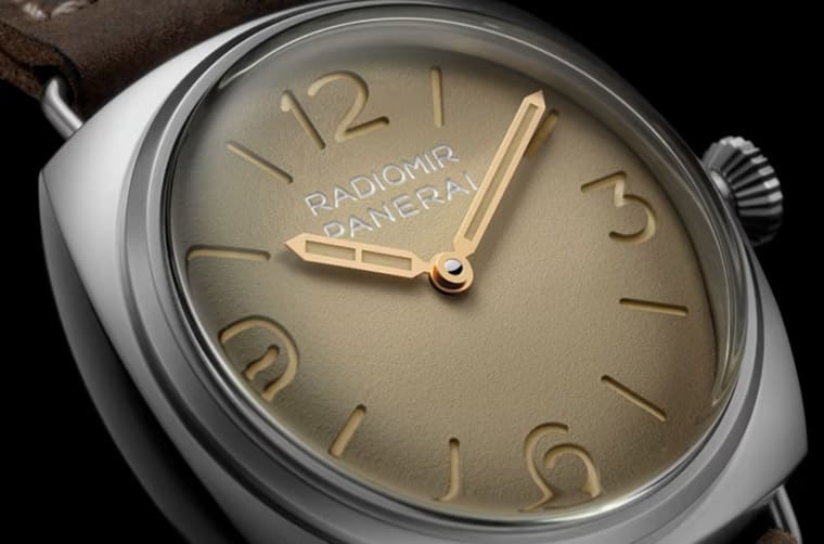 手錶與前作相同都以三明治面盤放大夜光物料的視讀作用,其米白色塗層和面盤顏色非常搭,此次沛納海替手錶換上金色指針(前面提到的兩款前作乃是設置藍鋼指針),還有一點是面盤12點方向的”RADIOMIR PANERAI “字樣和PAM01334和PAM01335為了呼應夜光物料而填上米白色調不同,PAM01350反而填入了白色調,讓手錶色彩的漸層感更強烈。