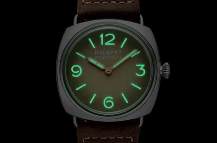 ▲沛納海招牌的三明治面盤有助於強化夜光物料效果,在愈暗的地方看時間反而愈清楚。