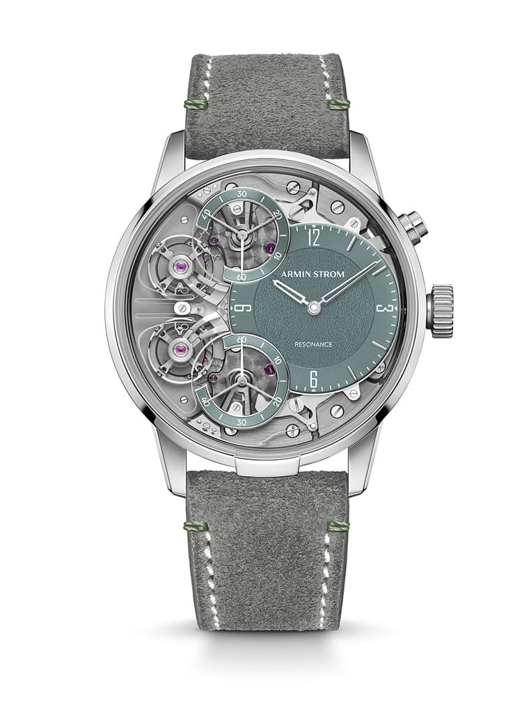 新款Mirrored Force Resonance仍採用不鏽鋼材質製作,不過手錶改用灰色Alcantara人造麂皮錶帶,接近錶耳處的縫線刻意採用綠色烘托面盤的變化,此次ARMIN STROM從老式機械設備獲得靈感,將手錶帶有Grenage紋理飾面的偏心錶盤以及雙秒刻度環改為清新的綠色。