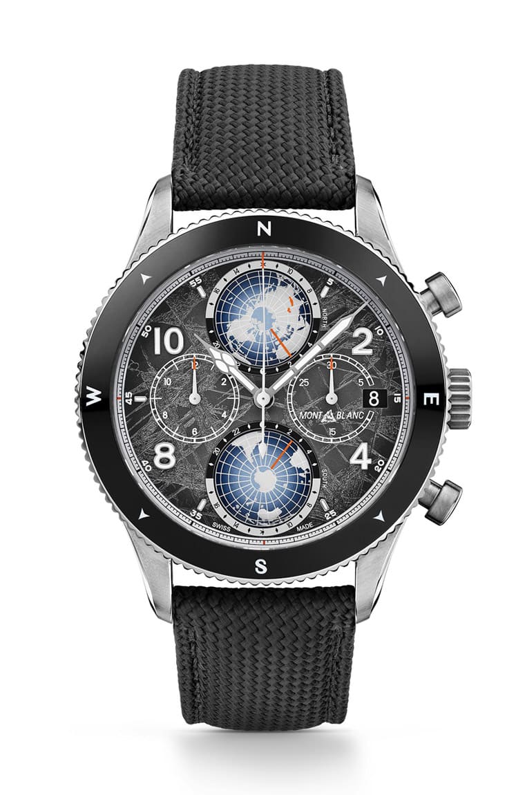 1858日期顯示自動零氧手錶The 8000為這批新作中的入門款,其以不鏽鋼製作錶殼,搭配飾有羅盤方位的黑色陶瓷錶圈,面盤的深灰色冰川圖案因為沒有其他小錶盤或顯時裝置而看得特別清楚,包括阿拉伯數字時標、指針、日期盤與羅盤方位的刻度都塗有夜光物料,手錶即使在伸手不見五指的環境還是可以辨識時間。這款錶面盤外圍每15分鐘會出現特別以橘色標示的分鐘刻度,底蓋則刻有高山輪廓以及”Spirit of Exploration”字樣。手錶內部搭載MB 24.15自動機芯,動力儲存為38小時。