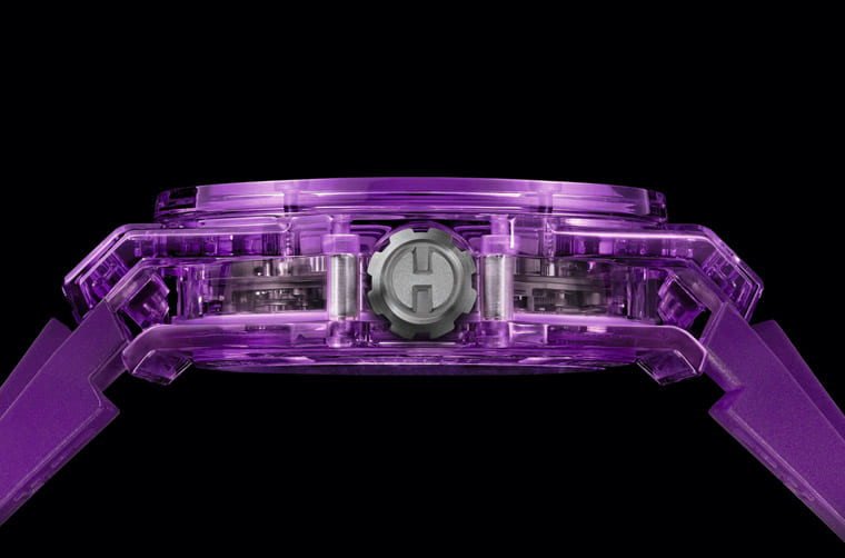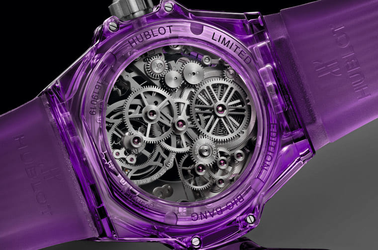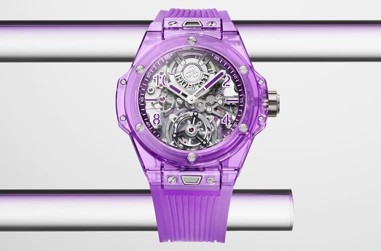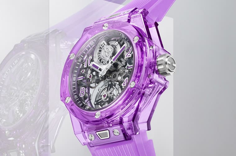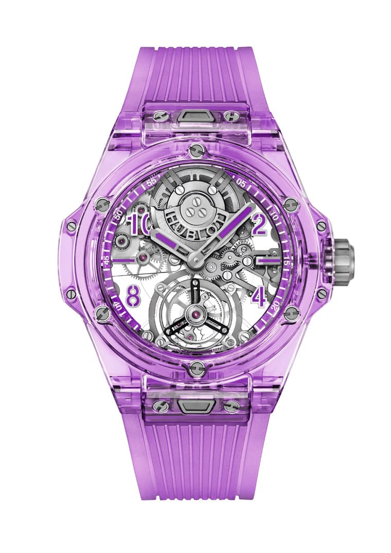 Big Bang紫色藍寶石陀飛輪腕錶,擁有44毫米的大氣錶殼,它的特殊紫色藍寶石錶殼由機密比例的氧化鋁和鉻元素組成,形成高透光感的紫色外觀。藍寶石的硬度僅次於鑽石,宇舶透過專門機具,裁切出大爆炸系列的多層次外觀,高度精準的線條與一般金屬製作的大爆炸腕錶如出一轍,展現品牌對藍寶石水晶材質的深入瞭解。錶款同樣含有宇舶獨家的「One Click」單鍵快拆錶帶裝置,佩戴者可根據服裝造型與場合,自行更換不同材質與顏色錶帶,原廠因應錶殼的特殊色澤而替其搭配紫色透明立體結構天然橡膠錶帶。