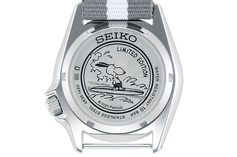 SRPK25K1背面刻印上史努比站在浪板上愜意衝浪的圖案,圖案右上角印有”LIMITED EDITION”字樣,並也同樣由此傳達手錶達到100米防水性能的相關資訊。
