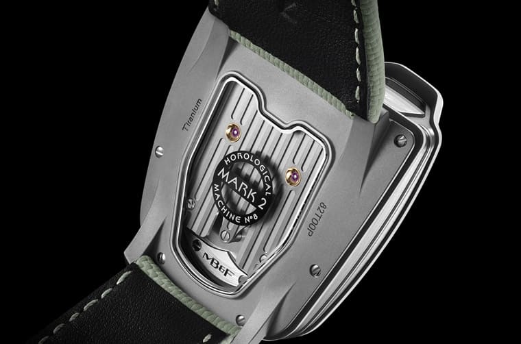 手錶的透明底蓋周圍採用鈦金屬製作,由於其造型帶有立體線條(四個角落都帶有向下延伸弧線的錶耳,所以銑削難度隨之提高),此外HM8 Mark 2為了詮釋雙氣泡式設計車頂,連藍寶石水晶鏡面也別出心裁地設計成雙拱型而非一般的圓形,要製作一枚這種造型的鏡面通常要花上好幾個小時,而且過程中一旦有差錯就必須從頭來過,導致這種立體鏡面的製作成本也比一般的圓形鏡面高了至少30倍。