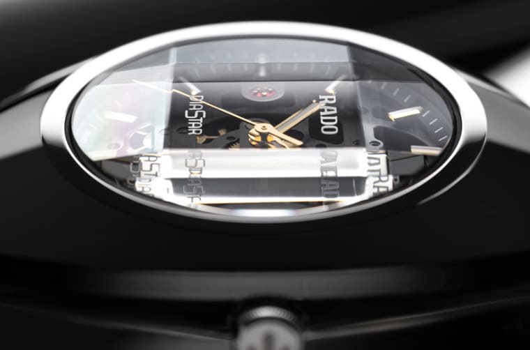 錶款的藍寶石水晶鏡面並非一般的弧面,反而帶有立體的方形切面,品牌分別在方型區域的上下印上”RADO”和”DiaStar”字樣,展現品牌原創基因並營造獨特的視覺效果,其實也能吸引佩戴者聚焦在手錶的鏤空面盤設計。面盤露出R808機芯的樣貌,包括發條盒、輪系,以及擒縱系統等,鐵灰色調的機芯橋板經過拉絲處理,與錶殼的Ceramos™金屬陶瓷顏色饒富統合感。