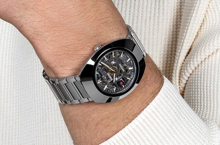 Ceramos™金屬陶瓷材質/R808自動上鍊機芯/時、分、秒顯示/藍寶石水晶鏡面、透明底蓋/防水100米/錶徑45x38mm/參考價:NT$ 60,000