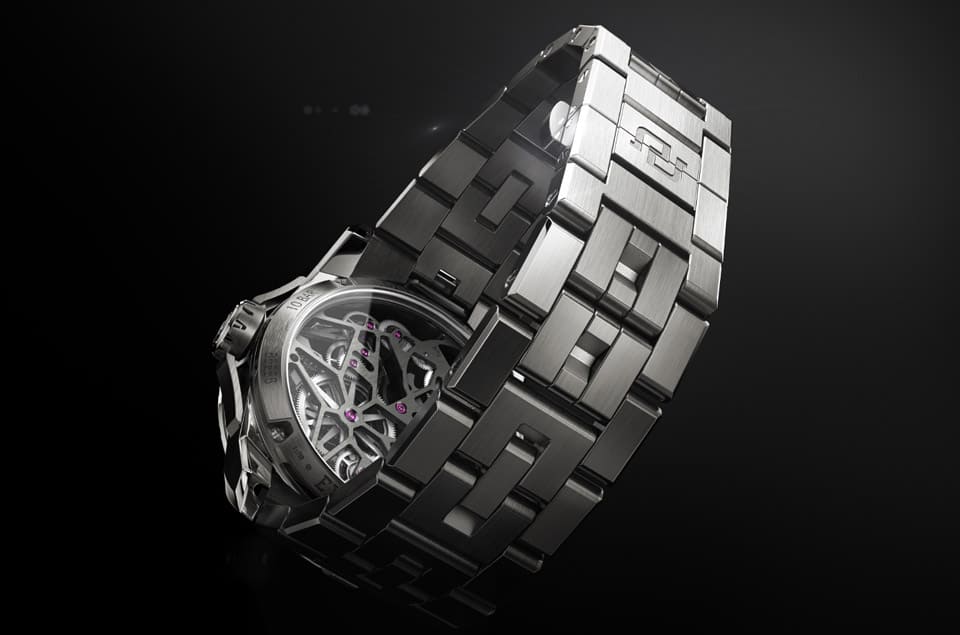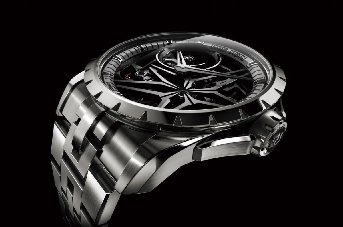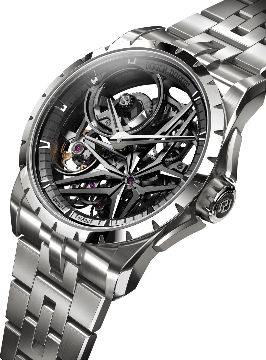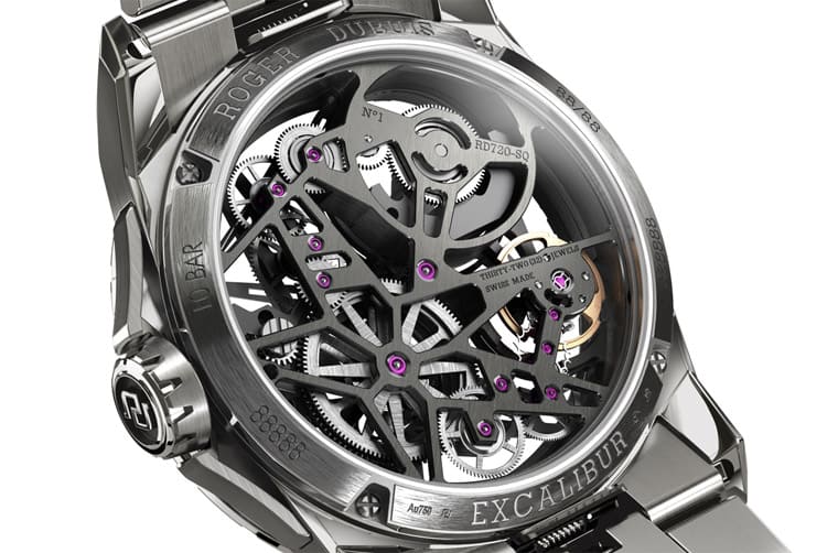 腕錶面盤呈現相當通透的鏤空設計,最引人注目的莫過於右側的星形橋板、10∼11點方向的鏤空微型自動盤,以及反轉至面盤側8點方向的擒縱系統。橋板原本僅是聯繫機芯零件並強化結構穩定性,但是ROGER DUBUIS羅杰杜彼別出心裁的設計進一步替其增添賞心悅目的造型美感,而微型自動盤不只鏤空甚至還帶有強烈立體感,羅杰杜彼倚重其能減少震動的好處,配合覆有金剛石塗層的矽質擒縱輪和擒縱叉等擺輪零件,一方面讓佩戴者能夠隨時一睹機械零件作動的實況,周密的設計也有效提升腕錶的運作穩定性,將羅杰杜彼熟悉材質特性、以精湛工藝一步步實現創意巧思以及注重佩戴舒適度與實用性的思維詮釋得淋漓盡致。