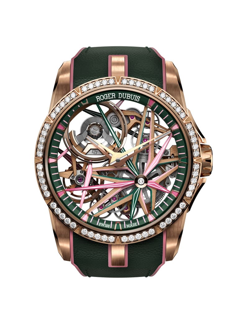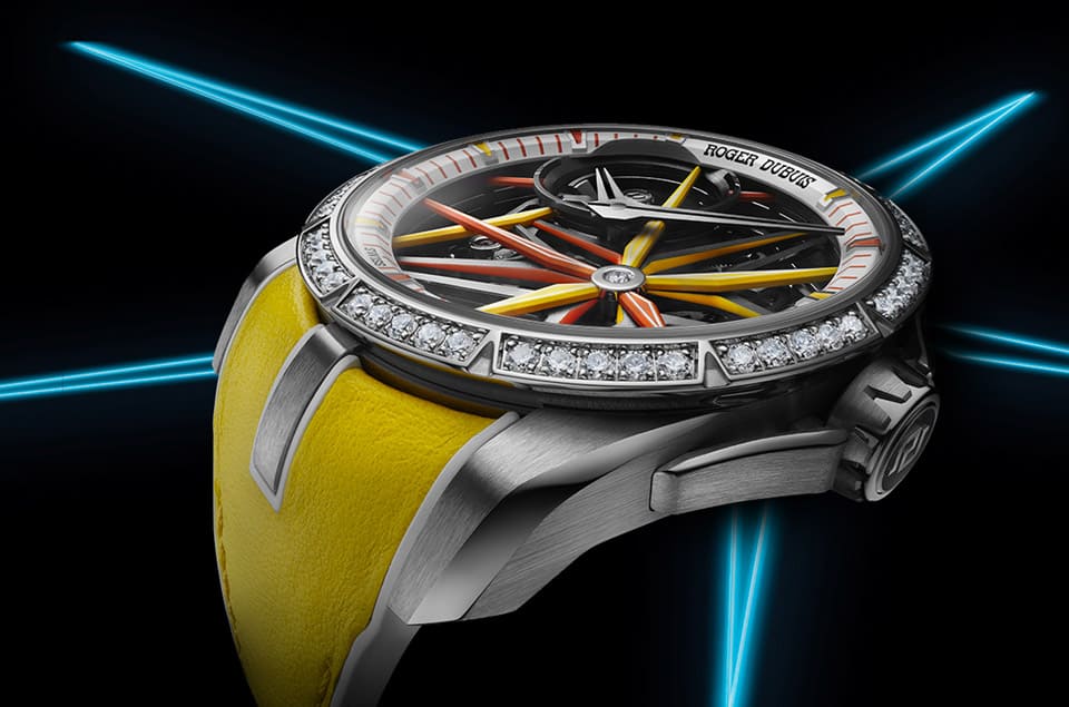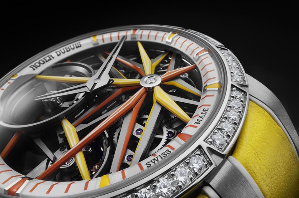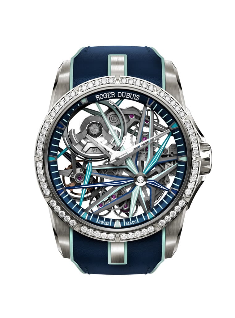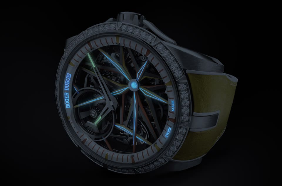 同樣經過鏤空處理的面盤隨著錶帶顏色不同,其外緣刻度環也有相應變化,例如黃色錶帶款式的刻度環為白色,時標則交錯塗上黃色與橘色,而深藍色錶帶款式的刻度環則改為藍色,並以深藍、藍綠以及水藍色點綴時標。色彩一路從錶帶、面盤邊緣延伸進鏤空機芯結構,錶款搭載RD720SQ 機芯,不僅採用鏤空處理與ROGER DUBUIS羅杰杜彼獨有的星形元素微型結構,更於機芯橋板運用獨家發光技術,打造黃色與橘色、或深藍色與淺藍色、抑或是桃紅色與綠色的豐富細緻設計,在深灰色澤的多數機芯零件烘托下,突顯機芯獨樹一幟的美感。在紫外燈照射下,面盤宛如換上嶄新的色彩組合綻放明豔光芒;而在黑暗情境下,包括 12 點方向的羅杰杜彼字樣、6 點方向的 "SWISS MADE" 字樣,以及時、分指針等處則會分別發出藍色和綠色夜光,在同一只錶上勾勒出三種不同絢麗風貌,讓人倍感驚喜。此外,羅杰杜彼更在星形橋板中央軸心鑲上一顆在紫外燈下會發出螢光的鑽石,與錶圈上的非螢光鑽石既互相輝映,又達到眾星拱月般的效果。