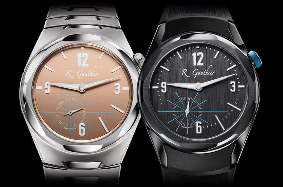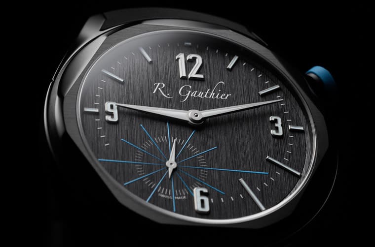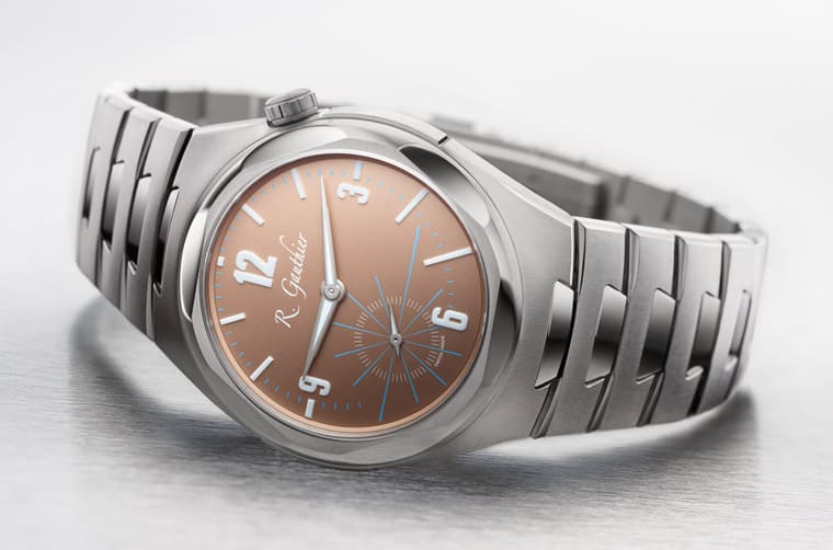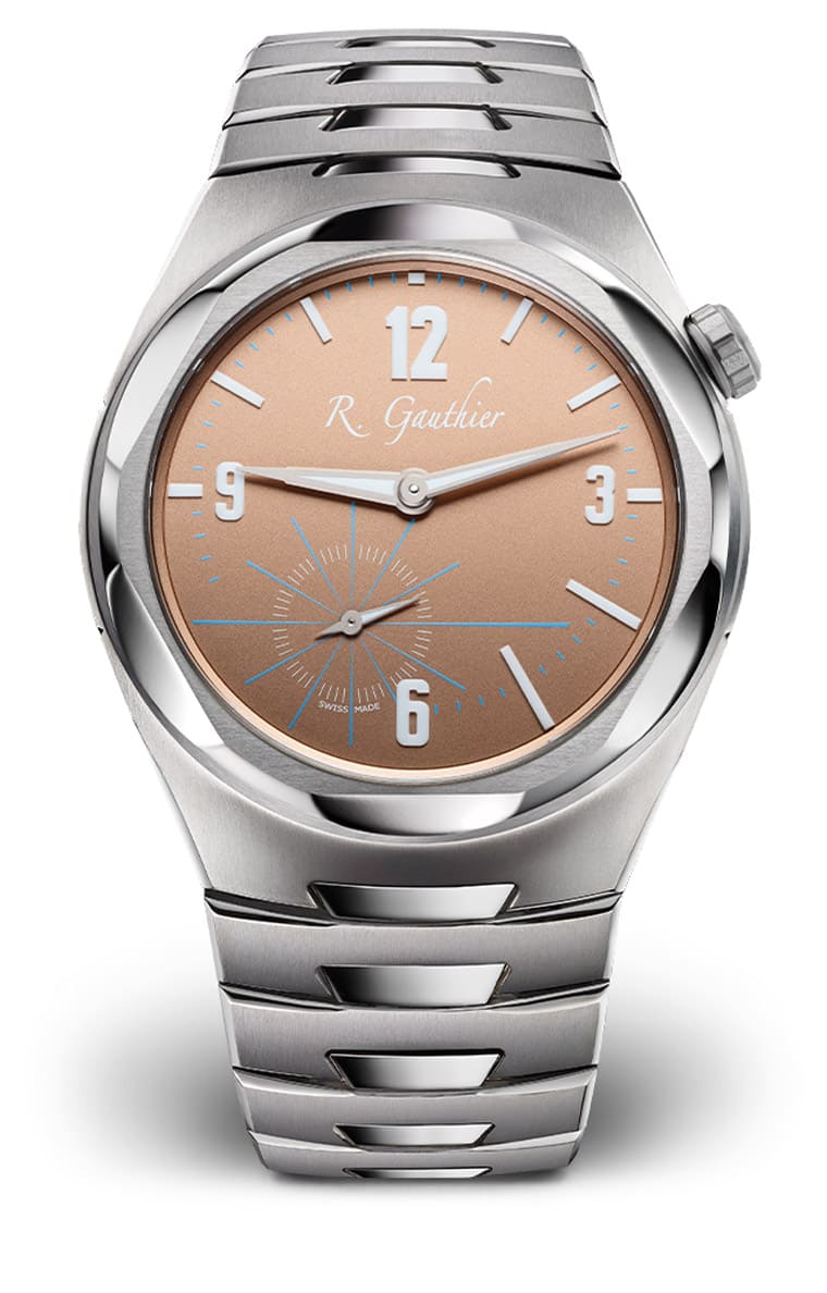 Titanium Edition Bracelet的面盤也是用天然鈦製作,塗上特殊塗層後形成帶點懷舊氛圍的鮭魚色。錶殼和面盤雖然都是圓形,不過注意看面盤便會發現時、分針軸心並非設置在正中央,而是略微高於面盤中心,而包括幾何時標,以及7點方向小秒盤的冰藍色線條刻度等長短都不一致,Romain Gauthier表示這種設計是為了讓面盤看起來更開放,面盤正交線與指針軸線在交會處形成消失點,讓手錶呈現流暢的視覺連續性。