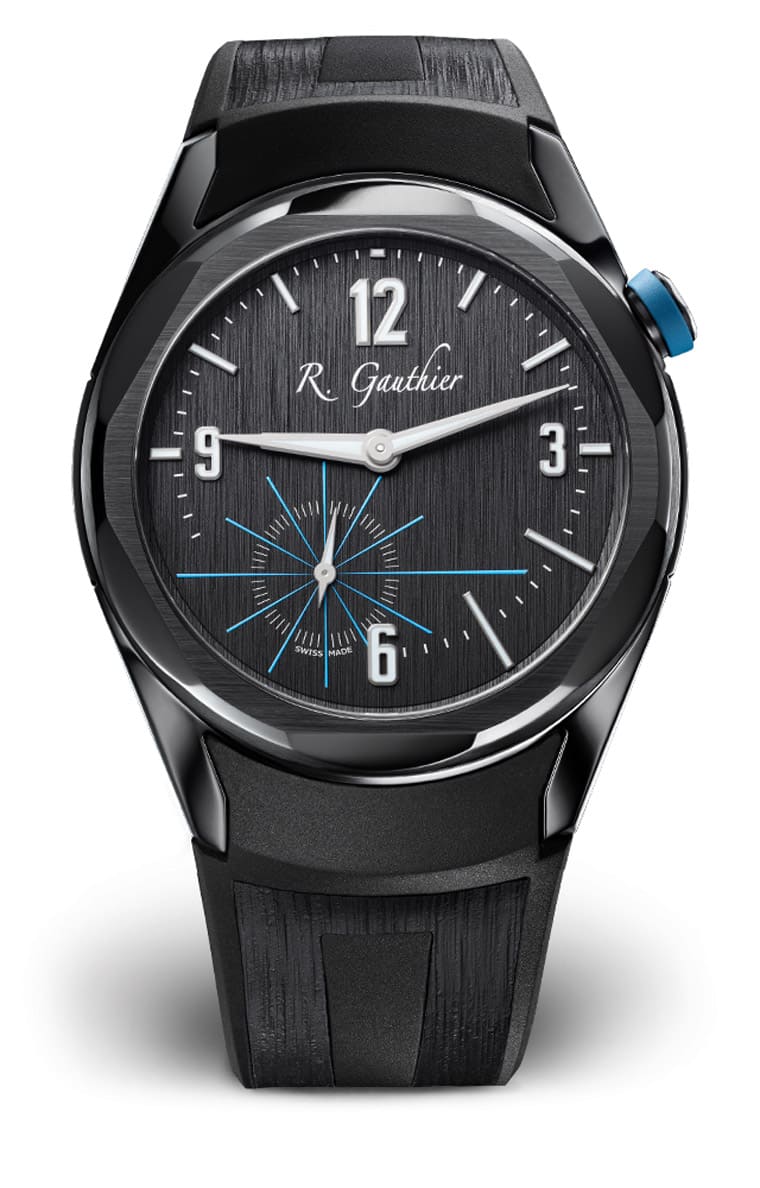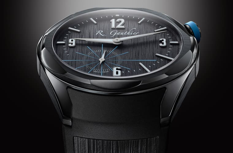 ▲這款C by Romain Gauthier錶殼的鈦金屬經過黑色ALDC處理,搭配黑色橡膠錶帶,並點綴冰藍色細節,呈現摩登時尚感。