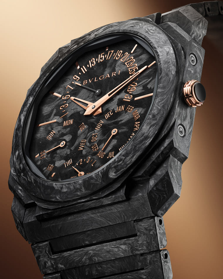 製作這兩款錶的挑戰除了融入新材質之外,要如何使用鍛造碳材質打造出Octo系列著名的多切面、複雜結構錶殼,而且錶殼厚度又還要維持在兩款錶本身的水準(Octo Finissimo Automatic厚度為6.9mm、Octo Finissimo Perpetual Calendar厚度為7.6mm),這兩點非常考驗品牌的製錶經驗與功力,寶格麗畢竟是身經百戰的資深品牌,因此最終他們順利突破材質的差異,打造出適合兩款錶的鍛造碳錶殼,其深黑色系外觀加上製作過程中形成的不規則紋路就像是渾然天成的身份識別一樣,每款錶都能展現出獨立個性,讓錶主能夠愈看愈有興緻。