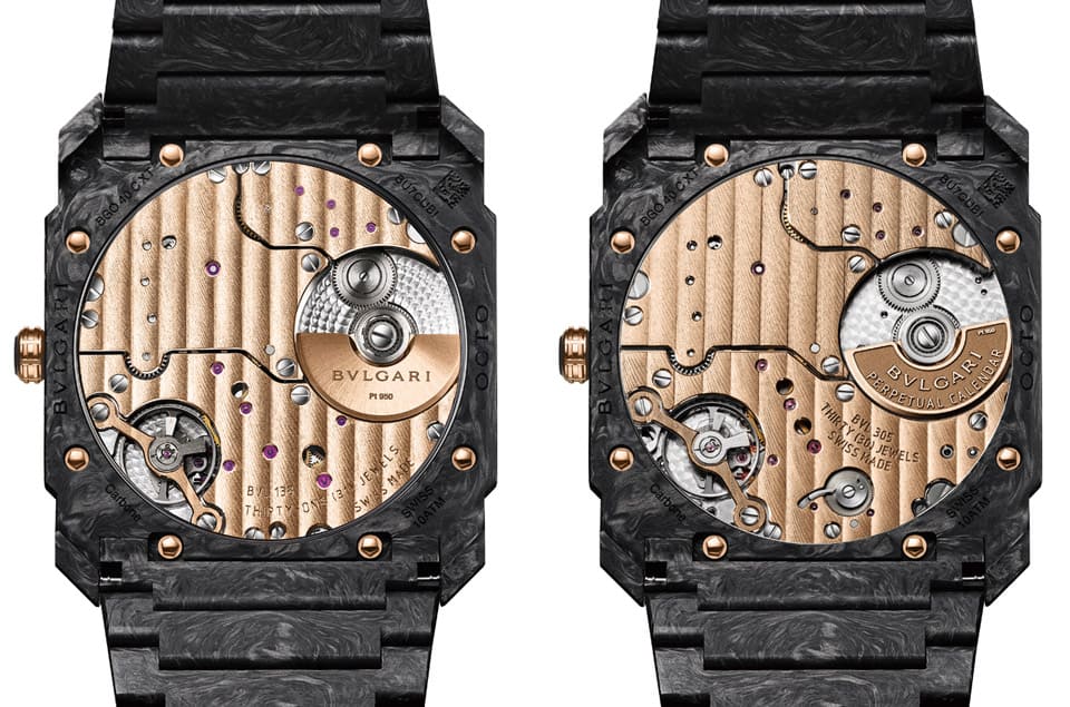 兩款Octo Finissimo CarbonGold錶背同樣以8顆玫瑰金螺絲固定於鍛造碳底蓋上,底蓋中央為藍寶石水鏡透明底蓋,裡頭無論搭載小三針功能的BVL138機芯或萬年曆功能的BVL305,都可以清楚看到機芯配置的微型自動盤(鉑金材質鍍玫瑰金),另外機芯底板是用玫瑰金製成,並是以日內瓦波紋,其間的銀白色夾板又呈現出魚鱗打磨,底板上還有各式的銀灰色螺絲、以及紅寶石軸承等,讓佩戴者在脫下手錶後可以大飽眼福,細細欣賞寶格麗力求做到位的嚴謹工藝水準。