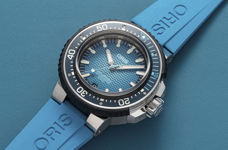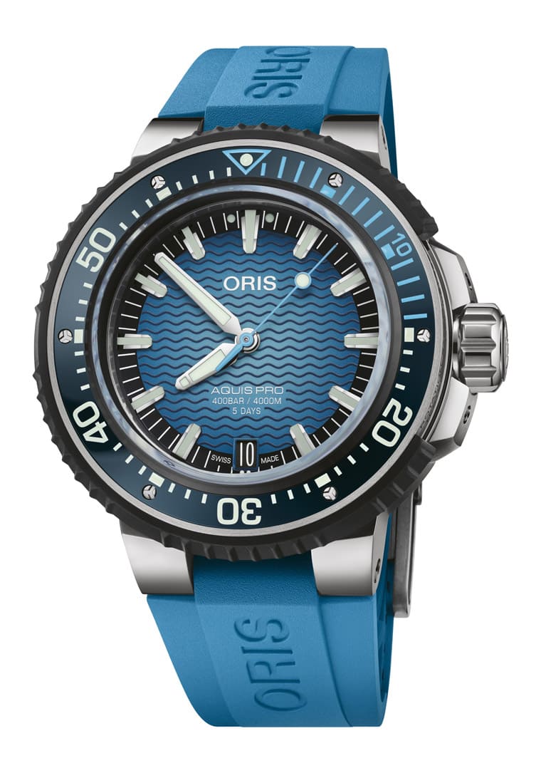 前兩年錶壇不停出現防水性能猛爆的深海巨獸,如今ORIS推出的AquisPro 4000m日期錶也達到了接近的水準,使錶搭載品牌自製Calibre 400機芯。同時也順利寫下品牌最新的防水深度紀錄,錶款擁有能夠承受高達400bar(相當於4000米深度)壓力的防水性能。外型部分,藍色漸變的面盤飾以水波紋,搭配藍色陶瓷錶圈與同色系的橡膠錶帶,搭配鈦金屬厚實錶殼來去水下自如。
