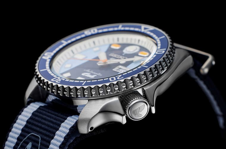 除此之外,前兩款SEIKO x HONDA Super Cub的錶冠頂部刻有油量標誌元素,SRPK37K1則是改刻1960年代隨著本田的公司名稱註冊的HM(HONDA Moter)翅膀廠徽。同樣的標誌在手錶配置的深藍/淺藍雙色尼龍織紋錶帶上也找得到,呈現與面盤、錶殼一體化的完整設計邏輯。