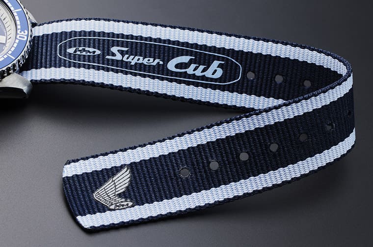 ▲深藍/淺藍雙色尼龍錶帶飾有”Super Cub”字樣及HONDA Logo。