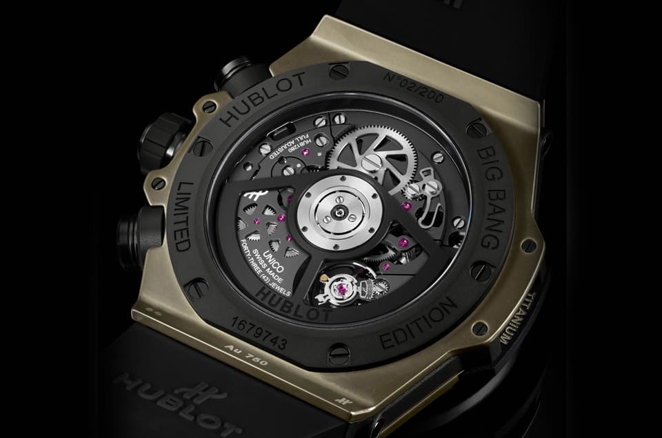 魔力金材質/HUB1280 Uuico自動上鍊機芯/時、分、小秒、日期顯示/計時碼錶功能/藍寶石水晶鏡面、透明底蓋/防水100米/錶徑44mm/限量200只/參考價:NT$ 1,207,000