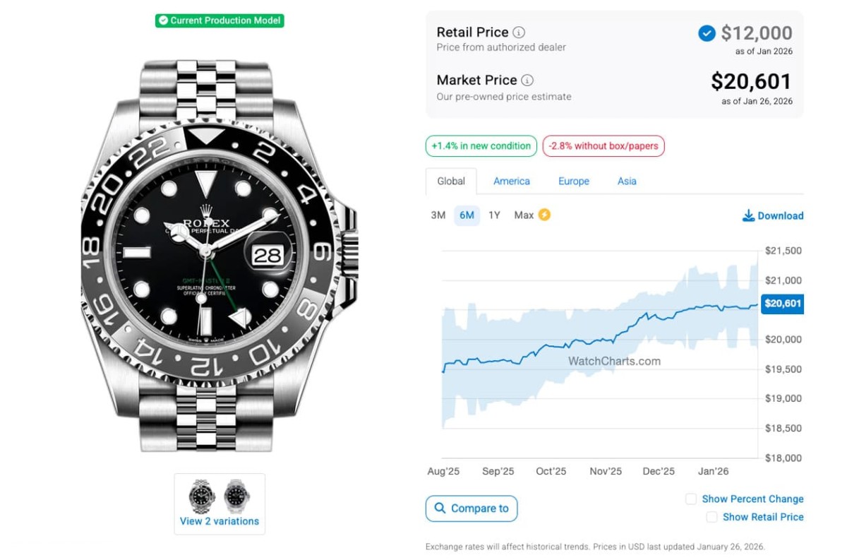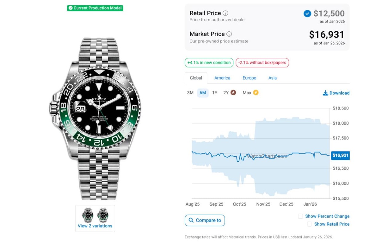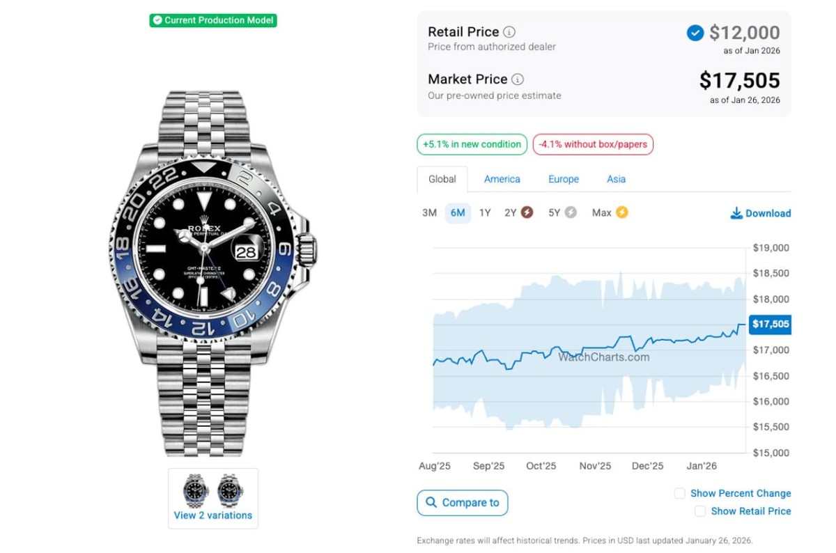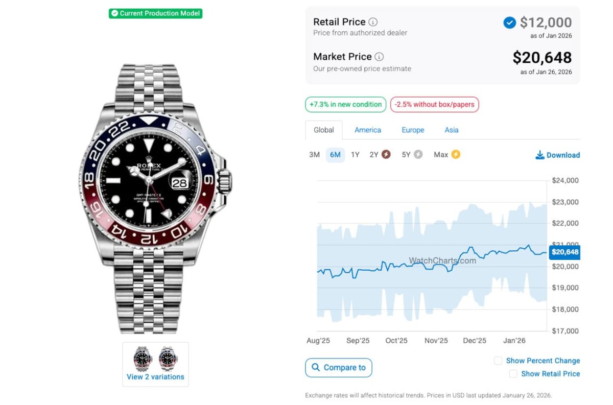 根據高級手錶市場調查研究機構WatchCharts的資料在2025年7月底時的追蹤,當時126710BLNR-0002、126710BLRO-0001、126720VTNR-0002和126710GRNR-0003(皆為五珠帶)的國外報價分別是16,706美金(約合台幣52萬2)、19,750美金(約合台幣61萬8)、17,081美金(約合台幣53萬4)和19,465美金(約合台幣61萬),已經處於二級市場熱門錶價格連續下滑的階段好一陣子了;至於又過了半年左右的現在,這四款鋼殼GMT-Master II爆款的身價又呈現怎麼樣的變化呢?
