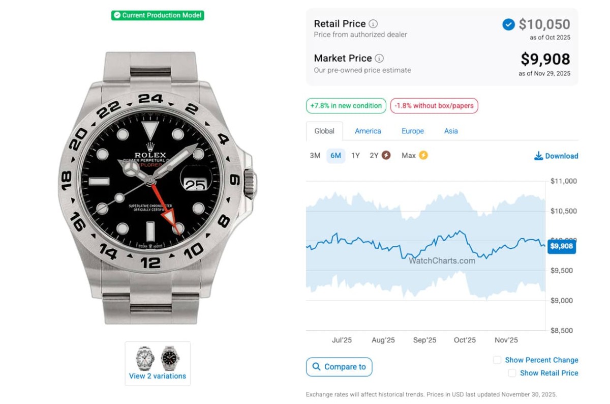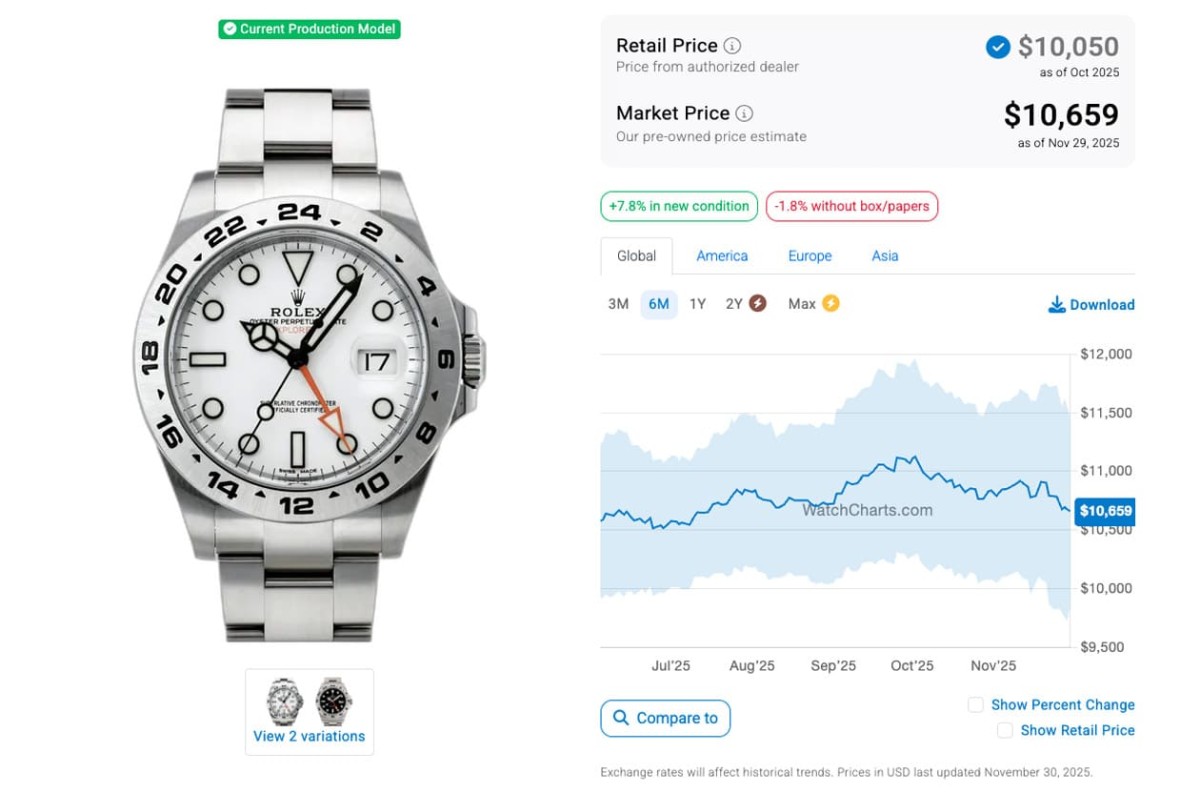 到了2025年11月,同樣由WatchCharts提供的資料可知,白面探二的行情到了2025年3月開始有稍微明顯的成長,最近一個月起起伏伏後回跌到10,659美金(約合台幣33萬5),屬於三個月來的低點;黑面探二則是半年內的前半段開低走高,還記得2025年4月時曾突然暴漲一波,結果5月開始又繼續下墜,6月又再漲一波上到7月又降溫,延續至8月還是有再往下,9月一度衝破1萬美金關卡,到了10月又跌破這條線,11月也是延續這樣的萬元美金保衛戰態勢,起伏顯得較大,如今二級市場價格為9,908美金(約合台幣31萬)。白面探二大致維持系列近年來的表現,就是略高於定價,但是溢價率並不算非常驚人,至於黑面探二身價前三、四個月雖然有所成長但沒多久又走跌,目前還是處於定價線之內。目前白面探二的溢價率為6%,看來黑面探二在日內瓦鐘錶與奇蹟錶展過後新款明朗化後,國外二級市場的行情又開始校正回歸,如今市場上大概能用30萬台幣左右的價格入手這款實用耐操的作品,即使它們不是特別熱門,但也不失為接觸勞力士運動錶物有所值的敲門磚選擇。