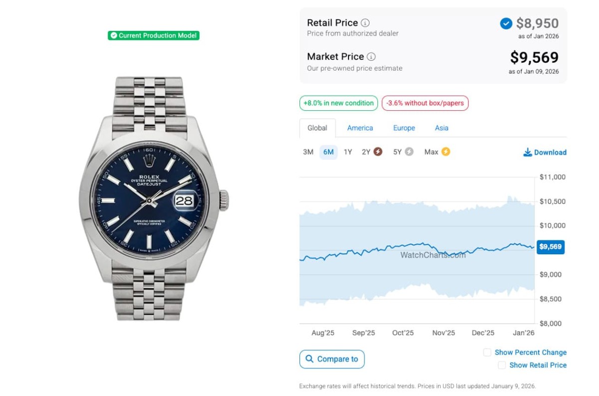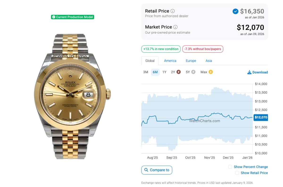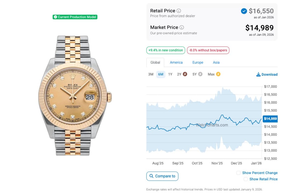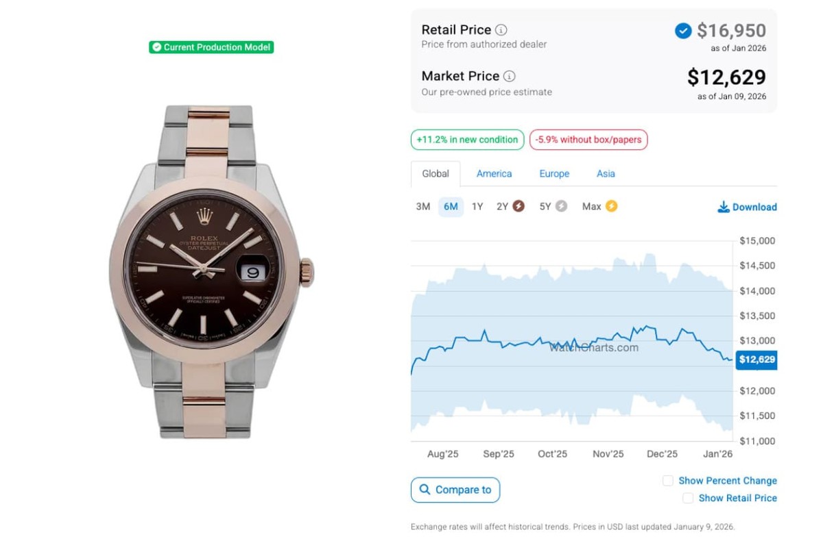 而到了2026年1月,這些Datejust 41的行情整體來看大都偶有起伏但還算穩定,一個月前後相比幾乎都沒有太大變化,除了永恒玫瑰金鋼的126301-0001二級市場價格近一個月來有比較明顯的降幅,目前身價回到半年內的相對低點,而白金鋼款126334-0003本月則有微微的成長幅度,至於剩下三款則是和上個月比起來變化不大。WatchCharts追蹤到五款錶現在的行情依序是126300-0002(不鏽鋼、拋光錶圈、五珠帶)的9,569美金(約合台幣30萬2)、126334-0003(白金鋼、坑紋錶圈、三板帶)的13,476美金(約合台幣45萬2)、126301-0001(永恒玫瑰金鋼、拋光錶圈、三板帶)的12,629美金(約合台幣39萬8)、126303-0010(黃金鋼、拋光錶圈、五珠帶)的12,070美金(約合台幣38萬),以及126333-0012的14,989美金(約合台幣47萬3)。比起半年前的行情,五款都是不降反升,逆勢成長讓人頗感意外。
