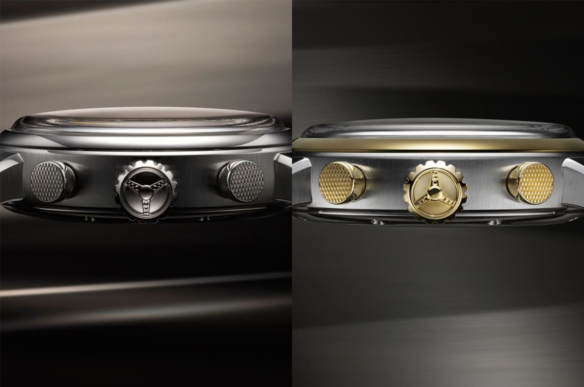 採用Lucent Steel™精鋼材質製作的Mille Miglia Classic計時碼錶外部零件多方採用拋光和緞面打磨營造視覺層次,至於異材質版本則以Lucent Steel™精鋼製作錶殼,另以18K玫瑰金打造錶圈、錶冠和計時按把等零件,其中計時按把表面經過滾花加工處理,與古董車剎車踏板的紋路互相呼應,另外腕錶的錶冠體積相對較大,周圍則是有凹槽紋路,便於佩戴者操作與調校。腕錶的錶耳乃至錶帶配置的錶扣都與2022年款式有所區隔,展現蕭邦靈活多變的創意。