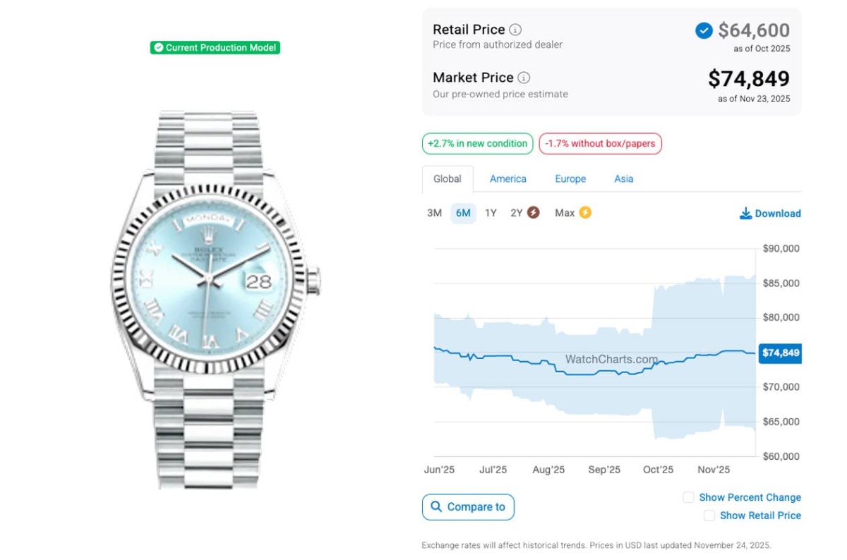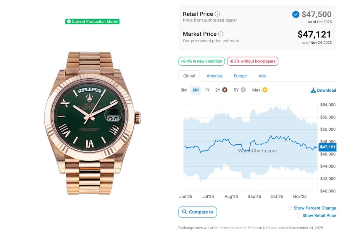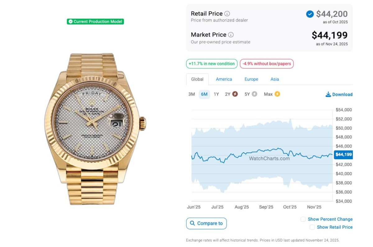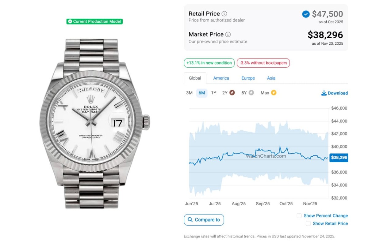 根據高級手錶市場調查研究機構WatchCharts的資料,四種材質的Day-Date入門款在2025年5月時的行情分別是黃金款的43,977美金(約合台幣138萬3)、永恒玫瑰金款的47,323美金(約合台幣148萬8)、白金款的37,364美金(約合台幣117萬5),以及鉑金款的75,825美金(約合台幣238萬5),當時僅剩鉑金總統錶屬於超定價水準,想入手這款系列旗艦作品預算要抓寬鬆些才有機會。