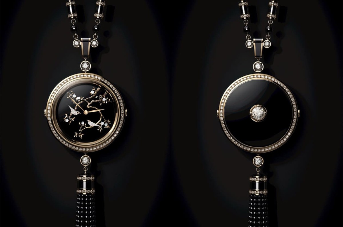 香奈兒在研發Mademoiselle Privé烏木屏風長項鍊錶時徹底走出了系列過往的框架,改用更奔放不羈的形式嶄新詮釋時計意義。這款作品將三種原本看似無關的事物巧妙融合,包括香奈兒女士寓所必備烏木屏風、於頸項間烘托佩戴者魅力的長項鍊,以及顯示時間的時計等。品牌將長項鍊綴飾改造為蘊含石英機芯的顯時工具,其以18K Beige米色金製作圓弧造型,錶圈鑲嵌130顆鑽石,不過真正的重頭戲仍在於揣摩烏木屏風的面盤:以黑色瑪瑙借指屏風的黑色漆面材質,再搭配金雕枝葉鑲飾、白色珍珠母貝雕刻而成的花卉,以及雕刻與鑽石鑲嵌的雀鳥圖案,將烏木屏風上的彩繪圖案立體化移植至Mademoiselle Privé烏木屏風長項鍊錶之中,最後畫龍點睛地加上兩枚柳葉型金質指針賦予作品顯時效果。佩戴者甚至可以將長項鍊的綴飾翻至背面,此處純粹以黑色瑪瑙搭配一顆1克拉鑽石,不僅展現品牌獨特美學,也巧妙將調整時間的機制暗藏其中。