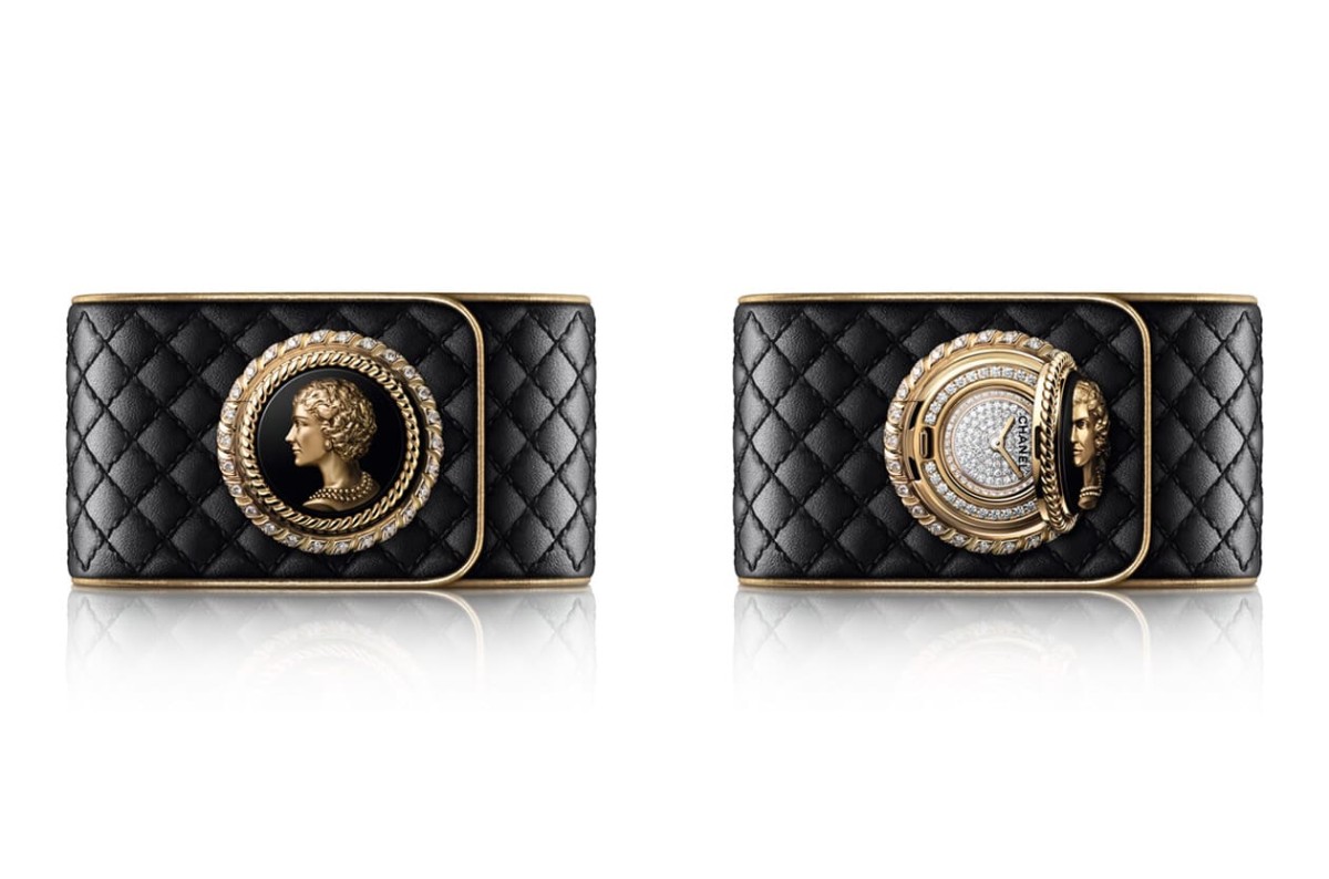 延續鈕扣腕錶與銬式手鐲錶帶的形式,繼斜紋軟呢、金屬鑲嵌鑽石以及Lesage工坊絲質刺繡等工藝創作之後,香奈兒腕錶創意工作室總監Arnuad Chastaingt從香奈兒女士設計的包包、服裝所使用的菱格紋獲得啟發,製作成經典圖騰錶帶。其中搭配黑色菱格紋皮革的Mademoiselle Privé鈕扣腕錶,錶蓋以微型雕刻工藝捕捉香奈兒女士雍容的側面輪廓,而且如同先前的Mademoiselle Privé鈕扣腕錶-獅子般,鈕扣周圍還精心裝飾黃金扭索雙鍊、黑色瑪瑙與耀眼鑽石,打開錶蓋亦會倍感驚嘆,鑲滿鑽石的面盤搭配金質時、分指針,強烈對比能清楚顯示當前時刻。