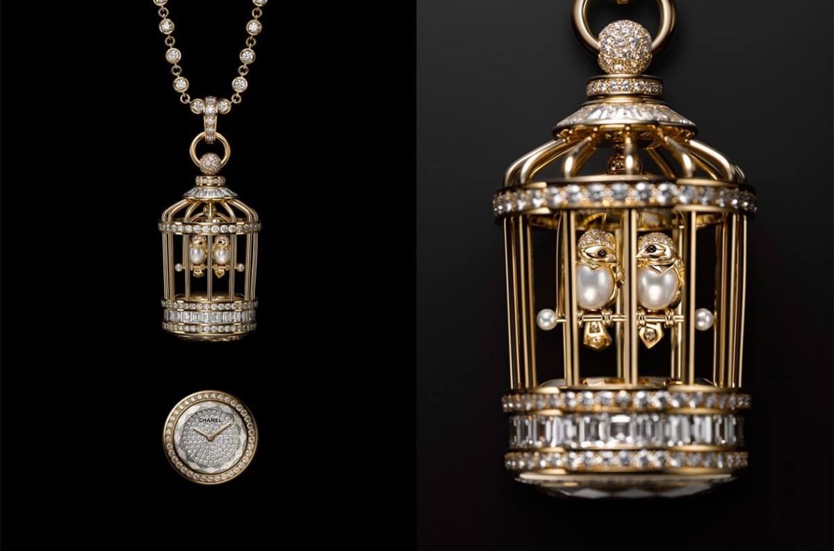 此為品牌又一從香奈兒女士生活中的吉光片羽擷取創作概念的得意之作,這款作品原型來自香奈兒女士寓所中的鳥籠擺飾,與烏木屏風長項鍊錶相較,鳥籠主題的長項鍊錶乍看更像是一條純粹的項鍊配飾,精湛的金工技巧打造出小巧卻栩栩如生的鳥籠及雀鳥造型。以黃金製成的鳥籠鑲有近500顆鑽石,駐足在其中一對雀鳥講究地雕刻成型,並鑲有鑽石以及珍珠,細緻的鑲嵌手法賦予鳥籠璀璨驚豔的視覺感受,然而這件作品最令人欣賞的亮點在於鳥籠的設計完全不依靠螺絲固定,高明的接合方式體現出香奈兒高度創意下的紮實工藝技巧。至於想要知道時間怎麼辦?只要將鳥籠稍微翻轉角度,露出底部就會發現一枚鑲滿鑽石的時、分指針面盤,隱而不宣地悄悄記錄時間推移軌跡。