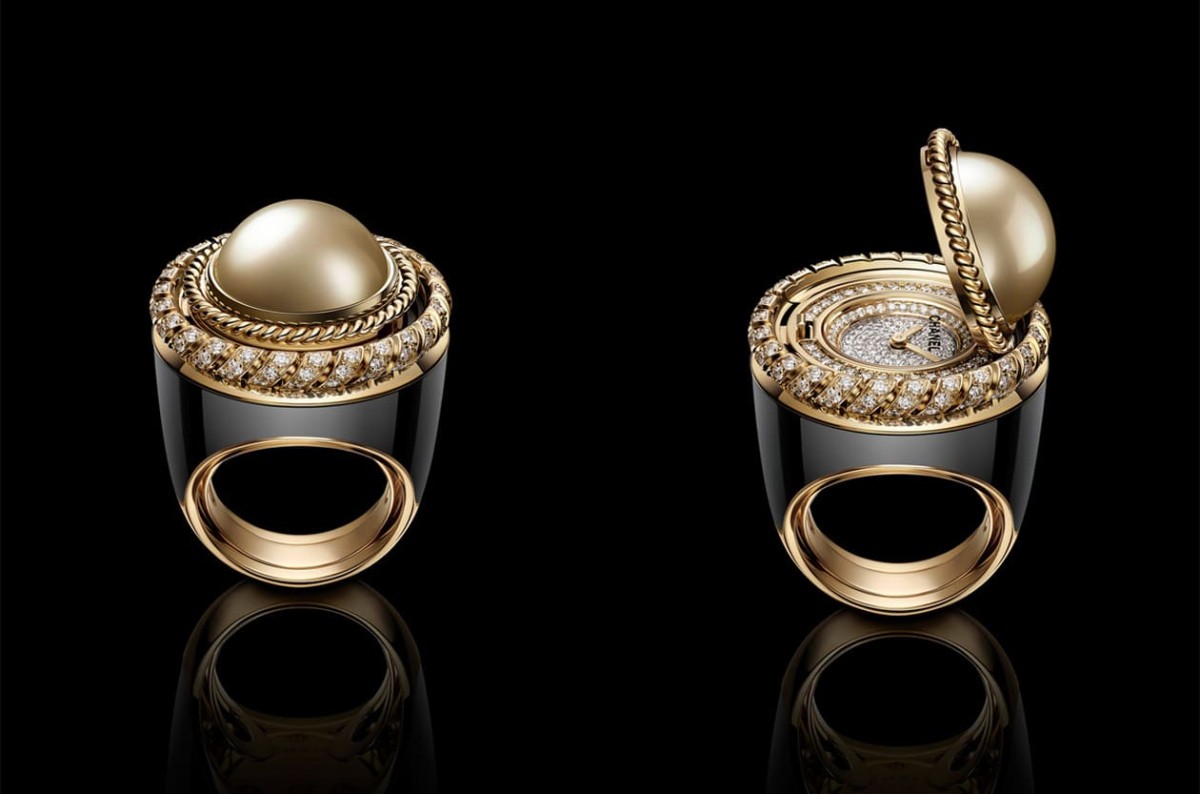 這件作品融合了香奈兒女士兩項鍾情元素:黑色及珍珠,將鈕扣腕錶系列隱藏錶面於鈕扣之下的概念轉化為戒指設計,戒指的主體除了黃金之外,還有經過ADLC鍍黑處理的鈦金屬,至於頂部的金色珍珠錶蓋經過工藝師的巧手裁切剛好成為平整的半球體造型,這和香奈兒女士會將鈕扣轉作為耳環佩戴的巧思頗有異曲同工之感;一如其他的Mademoiselle Privé鈕扣腕錶,在如此微小的體積中注入如此豐富的工藝細節,錶蓋周圍以及面盤都還有雕刻與鑽石鑲嵌工藝可以仔細欣賞。