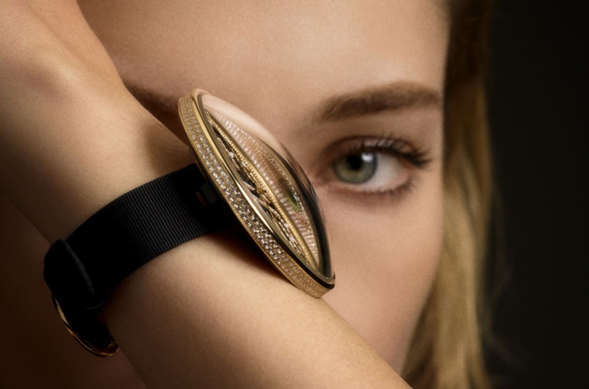 ▲55mm大尺寸黃金錶殼、穹頂狀藍寶石水晶鏡面搭配黑色羅緞錶帶為Mademoiselle Privé Pique-Aiguilles腕錶系列共通元素。