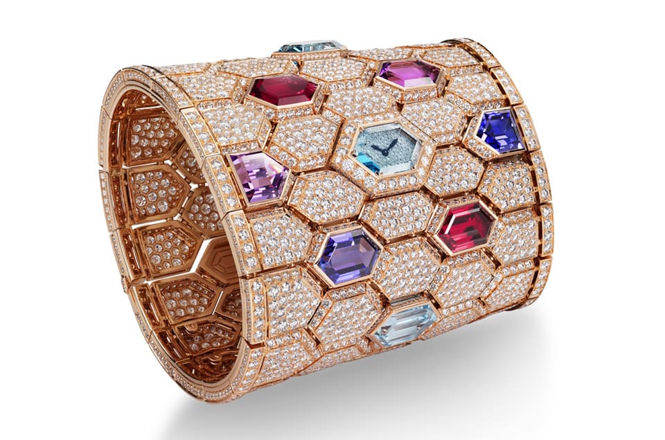 寶格麗於Serpenti Misteriosi Cleopatra頂級珠寶神祕腕錶的錬節鑲上9顆鮮豔彩寶,包含3顆六角形切割藍色拓帕石、2顆粉紅碧璽、1顆坦桑石、1顆紫水晶及1顆五角形切割坦桑石以及紫水晶等,其中有一枚藍色拓帕石底下結合了腕錶面盤構造,能夠顯示時、分資訊,並位在手鐲上最顯眼的中央位置。值得注意的是,手鐲上的蛇鱗錬節由於形狀和大小不一定相同,所以品牌工藝師在鑲嵌的過程中也必須隨時調整,因為除了彩色寶石之外,整副手鐲上可是鑲嵌了將近3,400顆的美鑽,它們都以雪花式密鑲工藝固定在錬節上,在鑲嵌過程中,每顆寶石都還會需要經過進一步切割以符合鑲嵌位置,有些甚至在過程中會需要切掉2/3顆寶石,如此堅持只為達到最高等級的淨度、亮度與色彩飽和度。