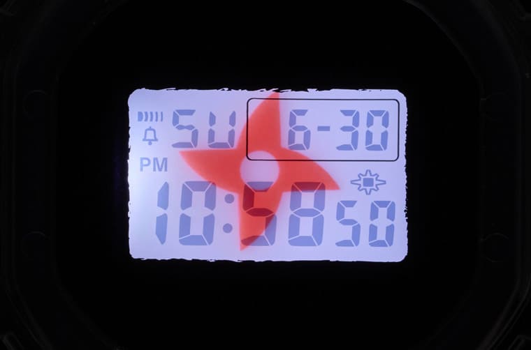 ▲擁有背光顯示功能的DW-5600NNJ,其發光時會呈現手裏劍的圖案。