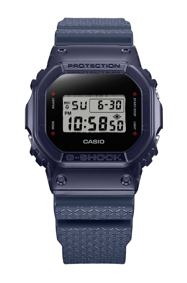 首先看到代表忍術「水遁之術」的DW-5600NNJ,錶款搭配飾有鎖子甲風格的熱壓印網格半透明藍色錶帶,藉以代表忍者潛入池塘、河流、護城河和其他水體中進行進行躲避和滲透任務。