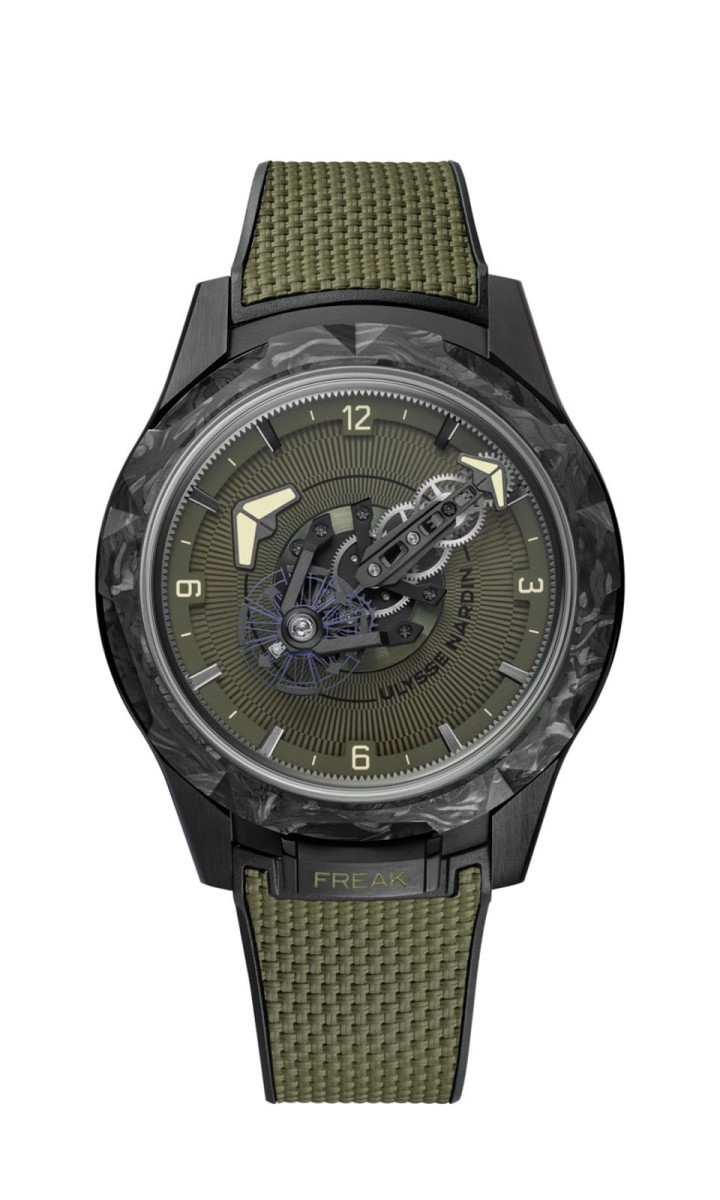 ULYSSE NARDIN雅典錶最具特色的Freak奇想系列2023年新品Freak [One Ops]近期再有新設計出現,因此手錶一現身立即引起關注,其一方面保有系列招牌的無面盤、無指針也無錶冠設計,品牌同時也透過材質與配色賦予手錶全新個性,猶如一款軍風版本的Freak手錶,粗獷剛毅的風格與面盤偌大的飛行卡羅素裝置一拍即合,一展奇想系列豐沛的創作潛能。