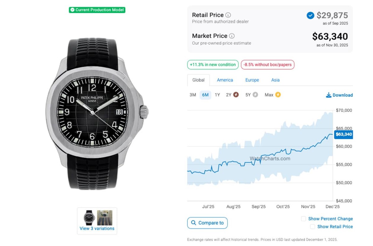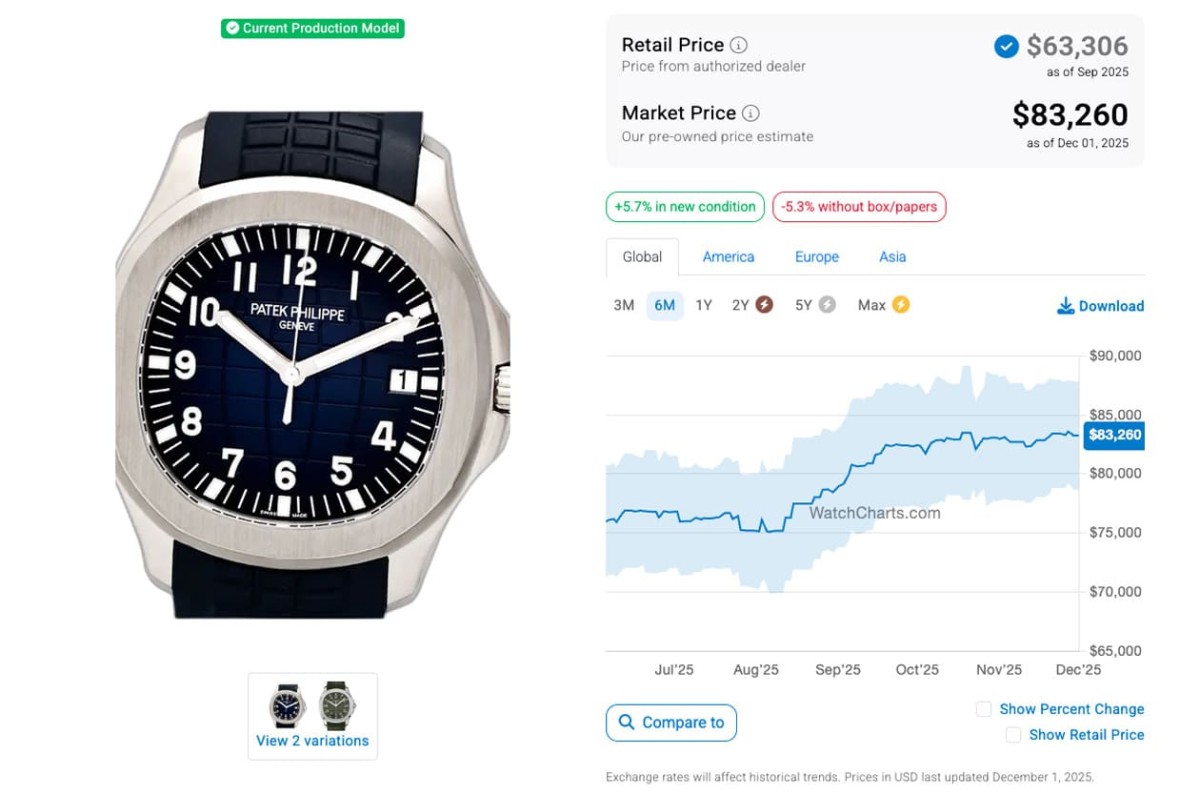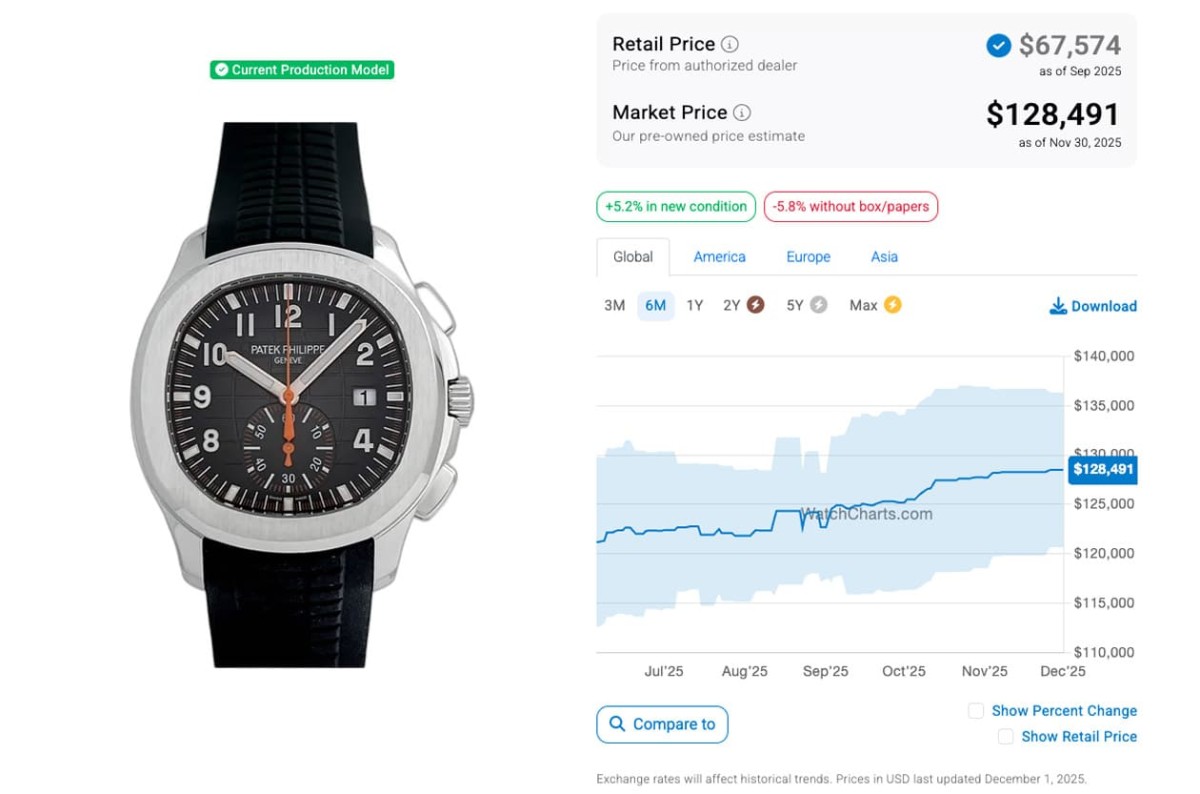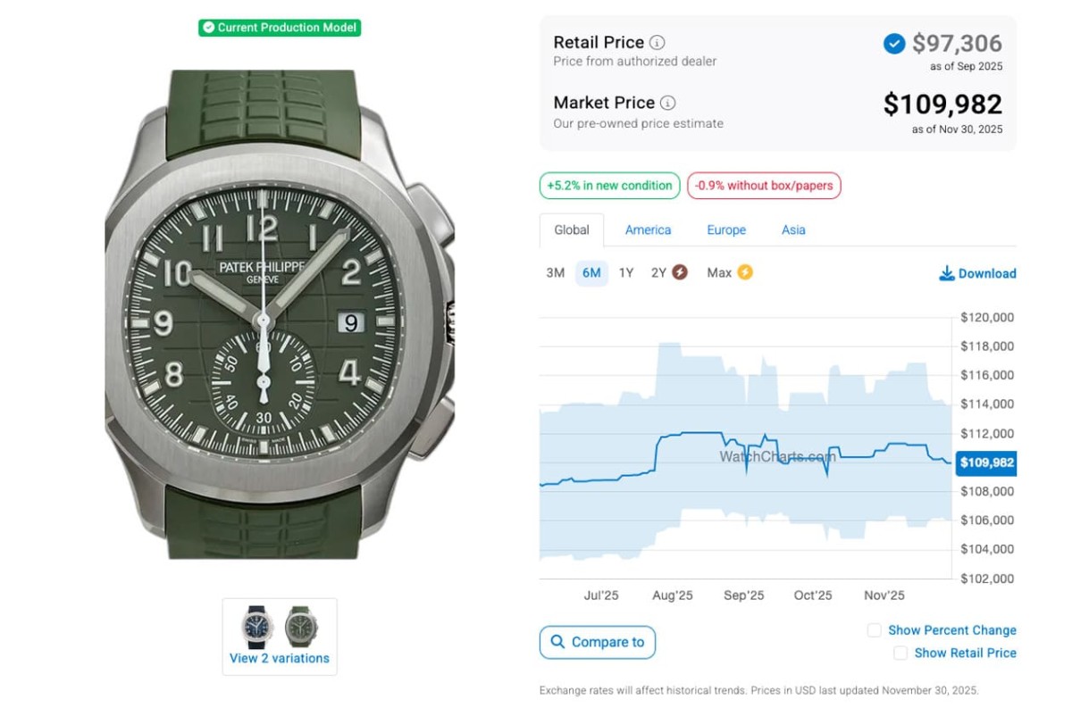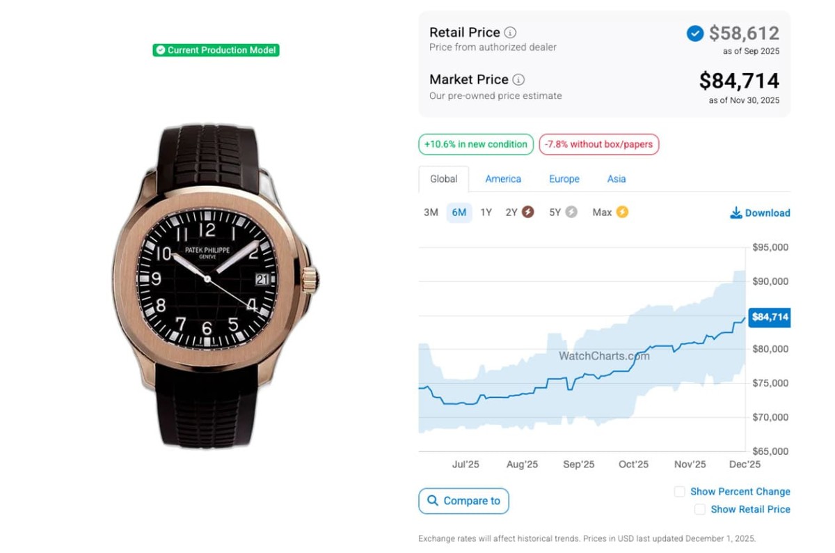 根據高級手錶市場調查研究機構WatchCharts的資料,上述Aquanaut系列人氣作品的二級市場行情在2025年6月左右分別是5167A:53,288美金(約合台幣167萬6)、5167R:74,279美金(約合台幣233萬7)、5168G-001:75,944美金(約合台幣239萬)、5968A:121,197美金(約合台幣381萬3)和5968G-010:108,522美金(約合台幣341萬4),每一款比起定價都高滿多的,由此可知在2022年第一季尾聲時手錶行情曾經衝到的巔峰狀態有多驚人,使它們經歷三年來的價格下滑期之後,超定價情況還是顯而易見。
