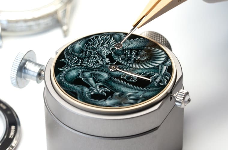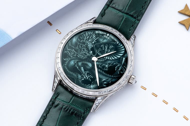 18K白金材質/1120自動上鍊機芯/時、分顯示/錶殼鑲鑽146顆,約重7.1克拉、錶冠鑽1顆,約重0.1克拉/綠調灰階琺瑯祥龍圖案面盤/藍寶石水晶鏡面、透明底蓋/錶徑40mm/限量1只