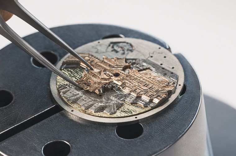 為了使面盤畫面栩栩如生,品牌工藝師運用了金銀鑲嵌工藝以刻畫出樹冠形態,替面盤的建築圖案畫龍點睛。此款作品與閣樓工匠灰階琺瑯高級珠寶-Dragon手錶一樣搭載厚度僅2.45mm的1120自動機芯,精巧纖薄的二針結構讓面盤成為展現精妙工藝的絕佳舞台。