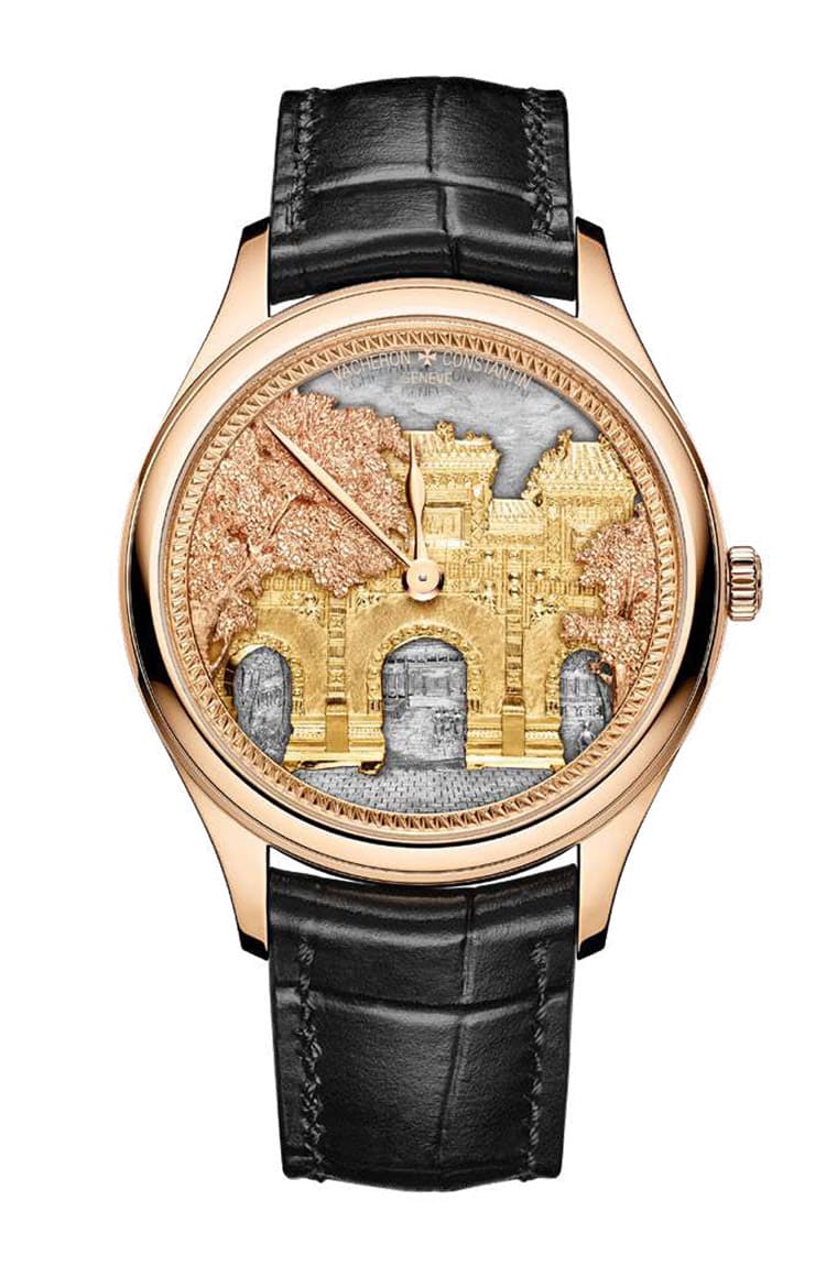 這款作品還能進一步分成4只錶,它們明顯也是圍繞”Récits de Voyages”主題而生,品牌透過這款作品突顯歐亞兩地凝聚於歷史時空的深厚淵源,以及江詩丹頓積極探索、開拓的旅行精神。此系列中有三款作品以玫瑰金打造、一款則是白金製作,錶徑為正裝錶標準的40mm規格。品牌旗下手工雕刻大師於四款手錶的面盤上生動刻畫吳哥城遺址、圓明園、北京孔廟和國子監,以及江詩丹頓19世紀時期的日內瓦總部(白金款),而且面盤圖案的靈感都是來自19世紀的畫作,這個時間點剛好就是江詩丹頓與中國的結緣之時。面盤圖案需以微雕及手工雕刻工藝在六~九塊厚度不足1毫米的黃金、白金與玫瑰金薄片上勾勒出動人圖景,隨後將薄片巧妙組合,或以不同的金質色調打造出構圖,或通過層疊覆蓋烘托帶有浮雕般的縱深效果。