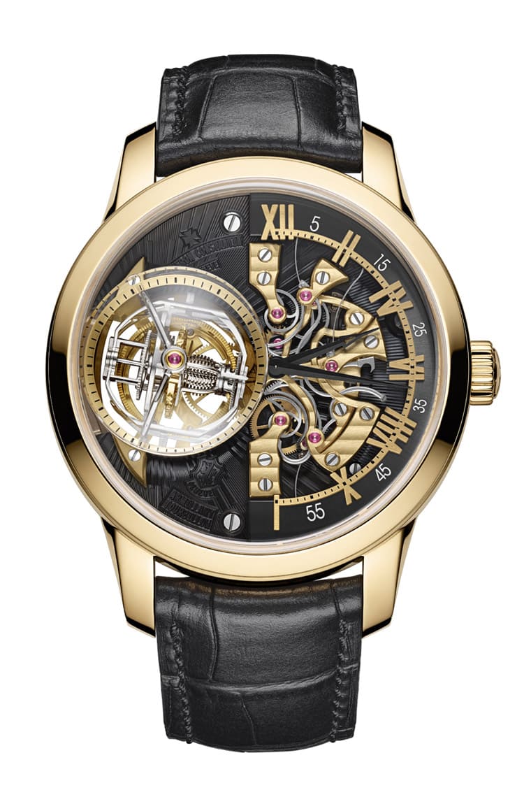 18K 3N黃金材質/1990手動上鍊機芯/逆跳時、逆跳分、小秒顯示/渾天儀式陀飛輪裝置/手工雕刻錶殼、手工雕刻機芯底板/黑色手工機刻雕花放射紋圖案面盤/藍寶石水晶鏡面、透明底蓋/錶徑45mm/限量1只