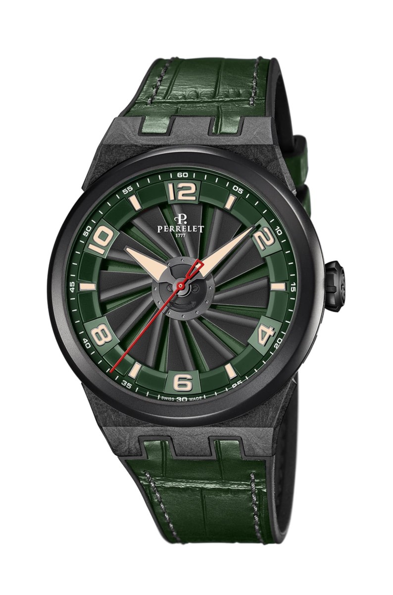 PERRELET採用堅硬輕巧的碳纖維製作錶殼,錶圈與底蓋邊緣則為黑色PVD不鏽鋼材質,因此腕錶外觀的黑色會有不同層次,碳纖維呈現不規則獨特紋理、不鏽鋼材質則為平順的霧面造型,品牌分別選用「午夜藍」以及「森林綠」兩大人氣流行色妝點旋風技術機制,除了下層面盤分別有藍色與綠色色塊,包括面盤邊緣的時標刻度環也呈現相同的顏色,而雖然兩款錶的秒針都是顯眼的紅色,不過PERRELET分別針對「午夜藍」和「森林綠」款式採用不同顏色的夜光塗層,前者為白色、後者則是米白色,進一步塑造兩款腕錶細緻的個性化視覺差異。