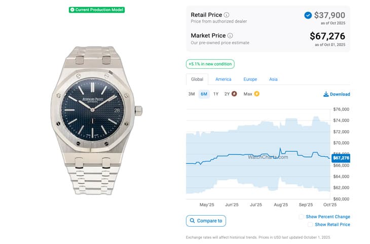可見自從改款以後,皇家橡樹Jumbo超薄二針錶的定價也在短時間內漲了不少,這和手錶近年的二級市場價格曾爆衝至頂點多少有關,不過從2022年後半年開始,等到16202ST陸續開始有貨進入到二級市場,它的行情也受到大環境影響逐漸從高點往下落,根據高級手錶市場調查研究機構WatchCharts的資料,16202ST的國外報價在2025年4月時已經持續下跌到66,346美金(約合台幣201萬8),可是把這樣的價格與手錶的定價一對照,不難窺見它的溢價率還是高得驚人。