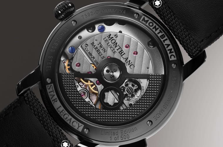 錶背可見明星傳承系列系列Nicolas Rieussec計時碼錶內部的MB R200機芯,這枚機芯蘊含導柱輪與垂直離合機制,後者對於零件磨損的程度相對低,而能改善計時盤在剛啟動計時功能時產生跳動的狀況。MB R200機芯的擺輪直徑達10mm,它的震頻為28,800A/h(4Hz),並設有雙發條盒足以提供72小時的能量,值得一提的是,限量的黑色DLC會連自動盤也一起鍍成黑色,使其在銀灰色調的機芯組件上顯得格外耀眼,輔以底蓋邊緣鐫刻的限量編號,突顯手錶相對稀有的特性。