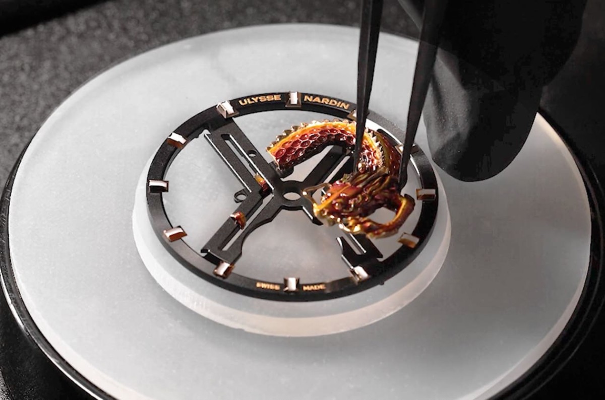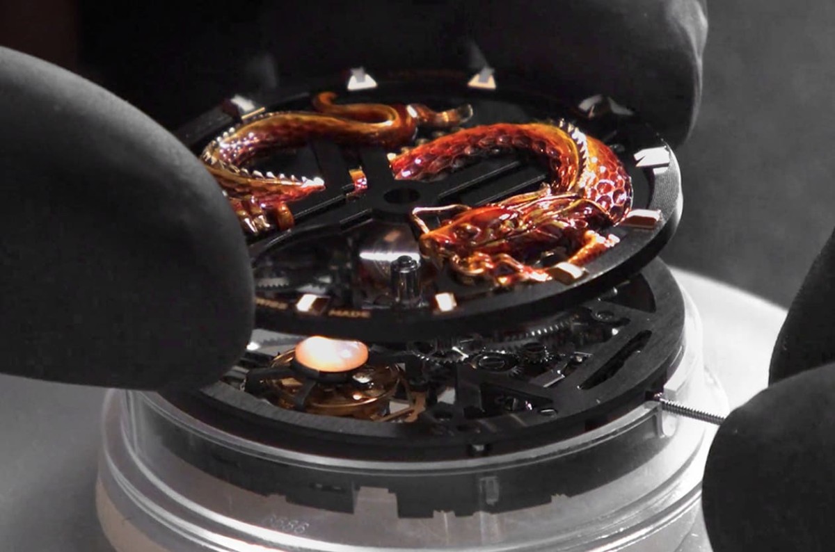 雅典錶2024年表現生肖錶的裝飾工藝不再是之前慣用的琺瑯,而是改為符合Blast陀飛輪調性的手工雕刻工藝,品牌旗下工藝師將玫瑰金雕鑿出氣勢萬千的金龍圖案,而且品牌並非直接將整枚金龍彫刻覆蓋於鏤空面盤上,而是善用"X"形框架,將金龍分成兩大部分,其中約在9點方向剛好是兩部分龍身零件的斷點,由此形成彷彿金龍在機芯內部穿梭飛騰的高度立體感,除了精細雕刻出金龍身上的每個細節之外,品牌工藝師還透過微繪技法讓金龍的色澤富有深淺變化——呈現由紅色、橘色漸變至黃色的漸層設計,甚至部分細節如龍角、龍爪與龍鱗還是金色調,將龍代表的尊貴與吉祥意義具象化為視覺可感的形象。光是製作面盤上的金龍部分,品牌分別花費三天工時於雕刻,還有一天則是用於上色,若是整只錶的研發時間更是長達兩年之久,因為過程中考慮到面盤加入立體金雕的關係,包括錶殼、錶圈和鏡面都要進行微調,才能順利置入金雕,這也提高了Blast陀飛輪金龍手錶的製作難度並且拉長創作時間。