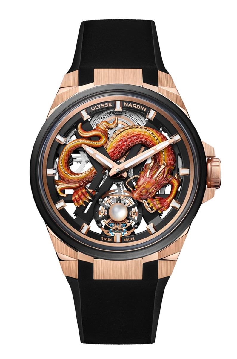 玫瑰金材質/UN-172自動上鍊機芯/時、分顯示/陀飛輪裝置/手工雕刻和微繪立體金龍面盤/藍寶石水晶鏡面、透明底蓋/錶徑45mm/參考價:NT$ 3,062,000