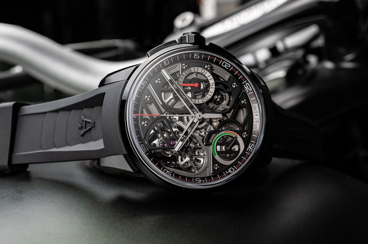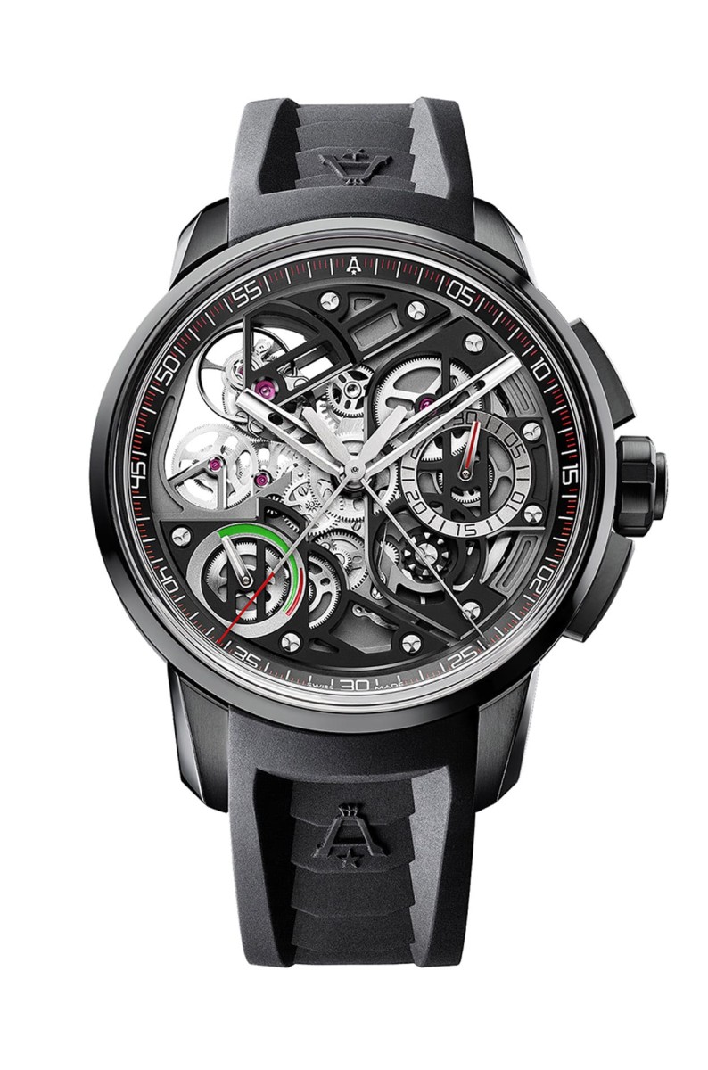 手錶融匯陀飛輪、飛返以及追針計時功能,加上自動上鍊機制,複雜度目前在ANGELUS旗下作品中屬於前段班,錶款採用黑色DLC鈦金屬錶殼,錶徑達47mm,體型雖然份量十足,但佩戴時相對輕盈,也展現高複雜手錶少有的運動個性。